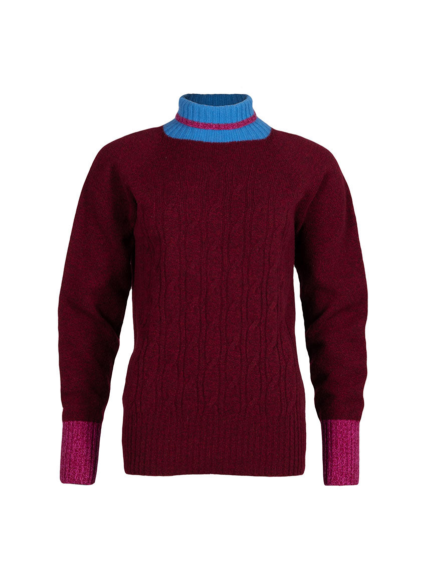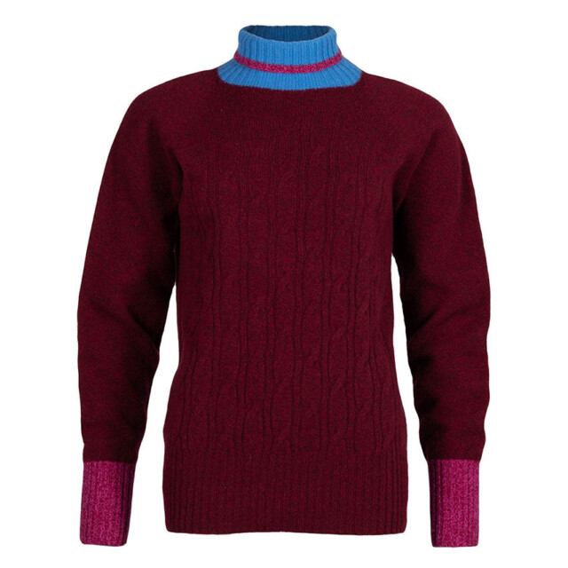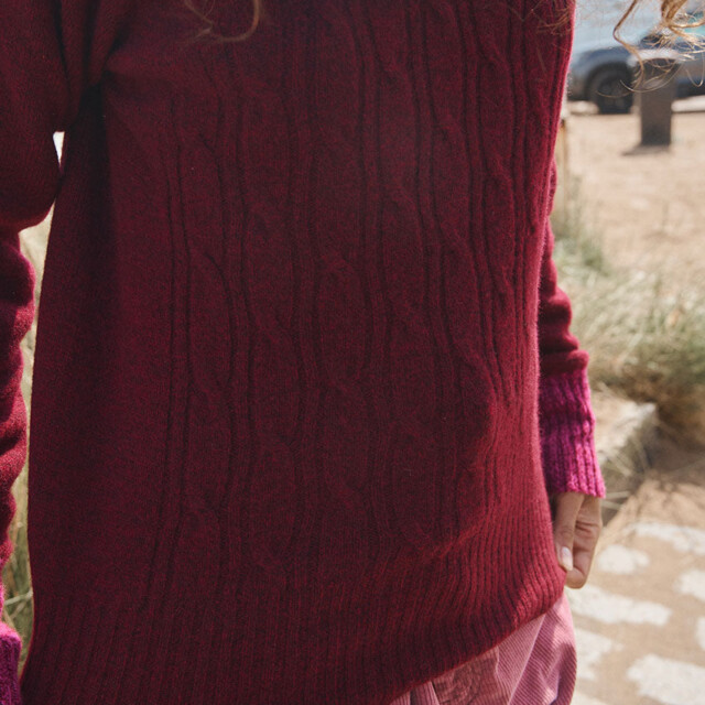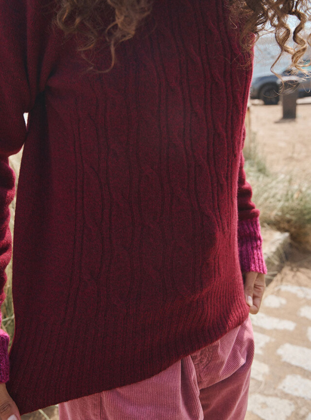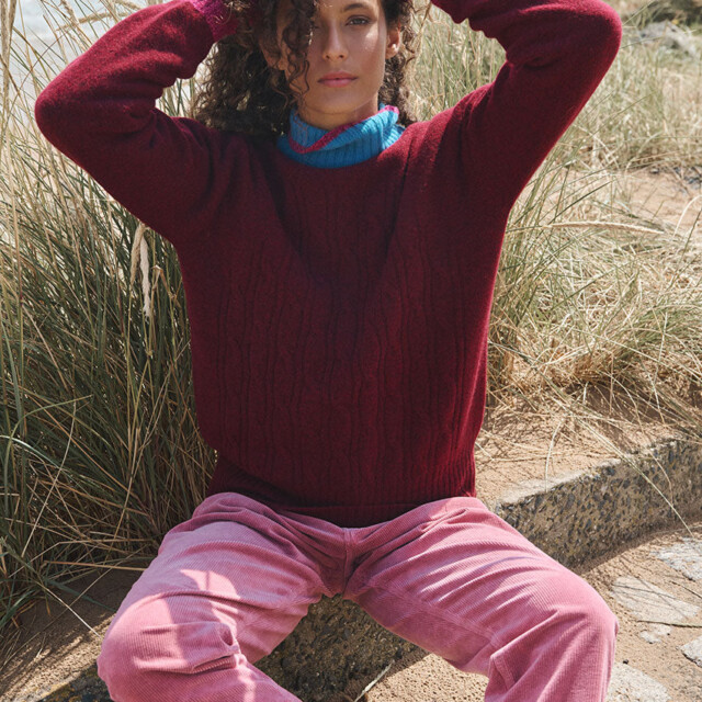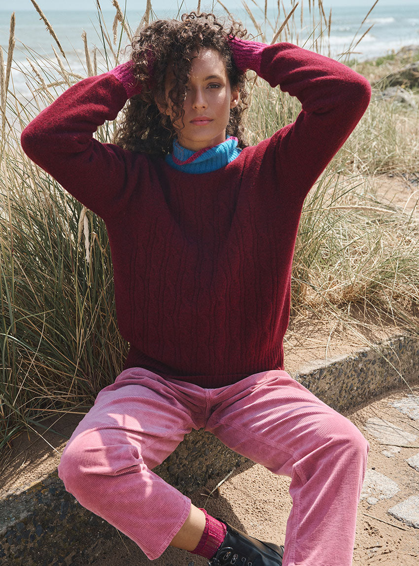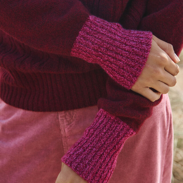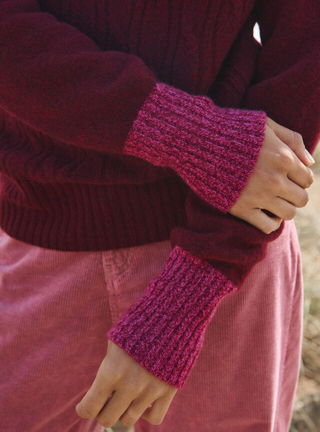Le pull Anna en rouge terre mouliné joue la carte du contraste audacieux. Sa maille jersey torsadée et ses emmanchures raglan offrent un volume confortable, tandis que le col bleu rehaussé d’un liseret rose mouliné répond aux manches assorties. Un mélange de couleurs original et chaleureux qui apporte du caractère à la silhouette.