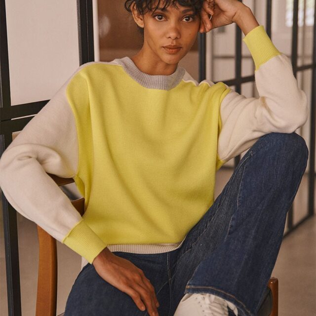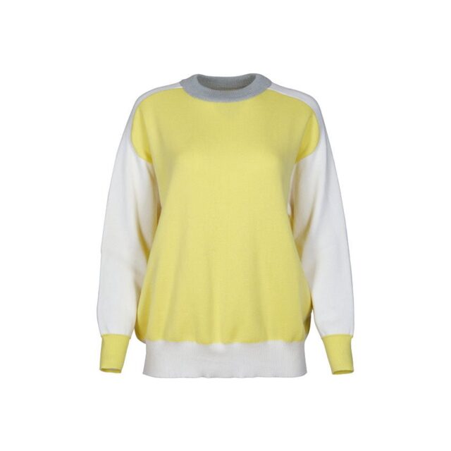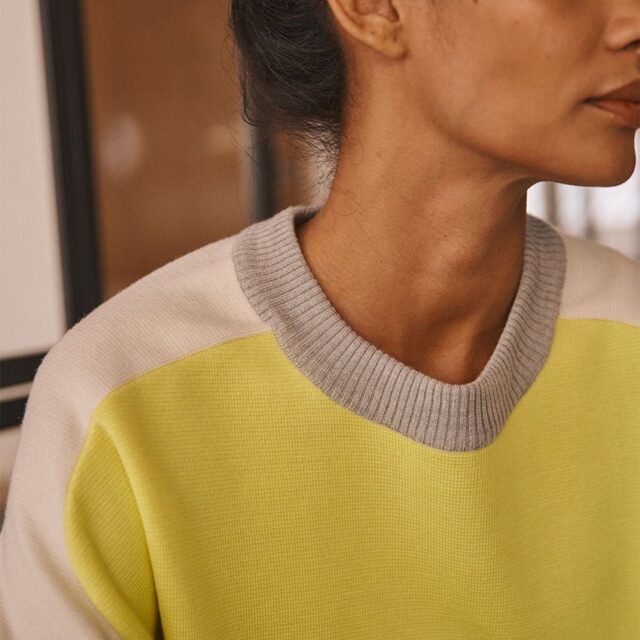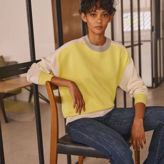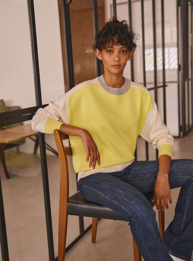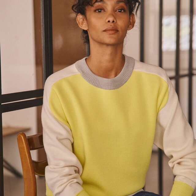 Le pull Aude en jaune tonique insuffle une dose de bonne humeur instantanée. Sa coupe loose en maille jersey et ses emmanchures marteau offrent un confort enveloppant, tandis que les manches et bords-côtes en blanc naturel créent un contraste doux. Le col gris clair apporte une touche moderne. Un pull lumineux, pensé pour réveiller les journées grises.