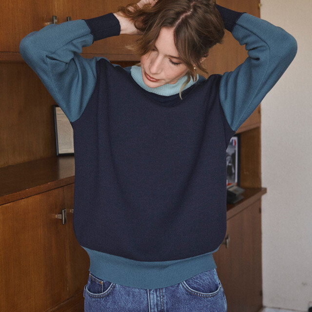 Le pull Aude en marine révèle une élégance moderne avec son col bleu glacier contrastant. Tricoté en maille point de Rome dans une coupe loose avec emmanchures marteau, il offre un confort décontracté. Les manches et bords-côtes bleu paon ajoutent une touche graphique subtile. Un pull doux et colorblock, idéal pour réveiller les looks d’hiver.