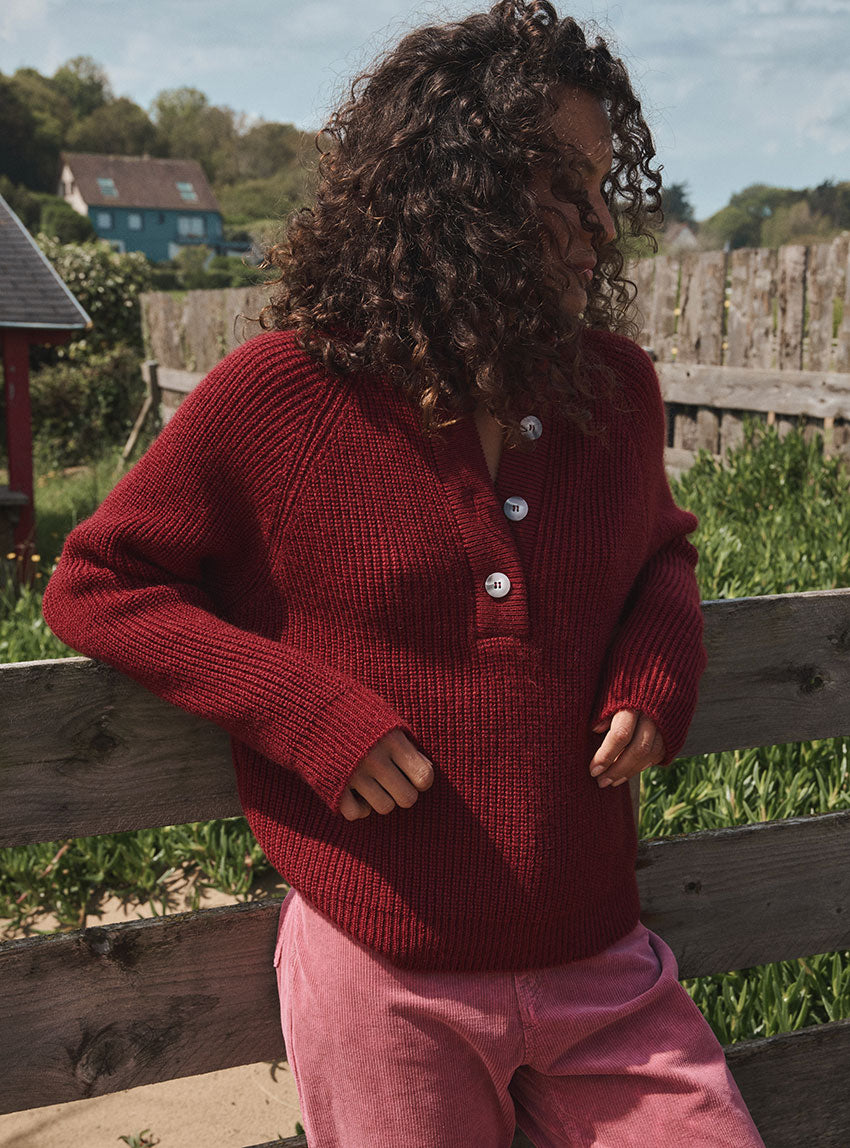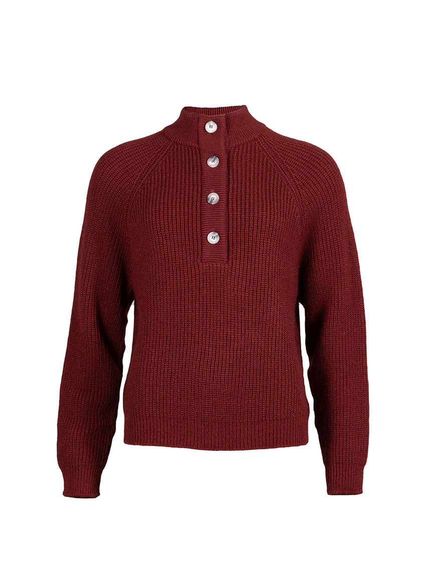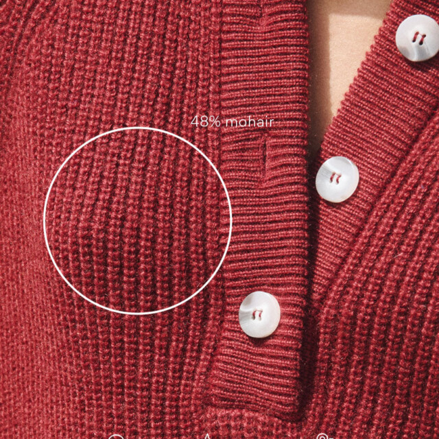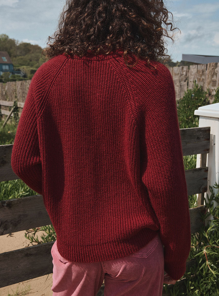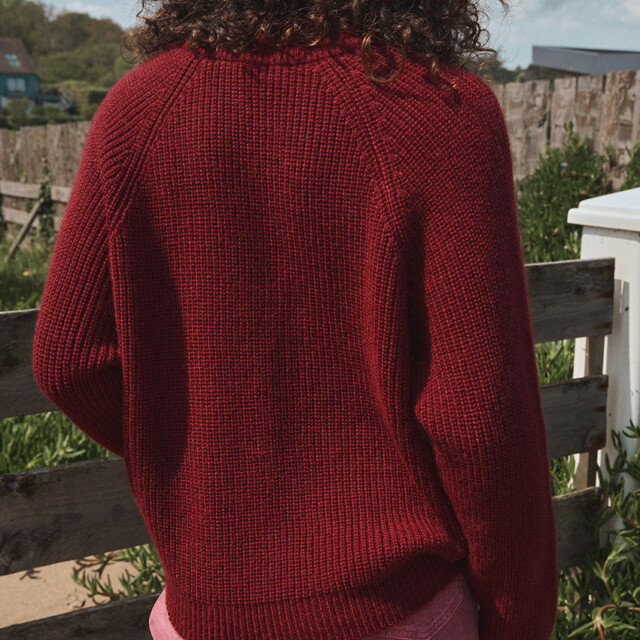 Le pull Aurélie rouge Médoc, séduit par sa maille perlée en mohair douce et texturée, et son col montant élégant, pour un look à la fois chaleureux et raffiné.