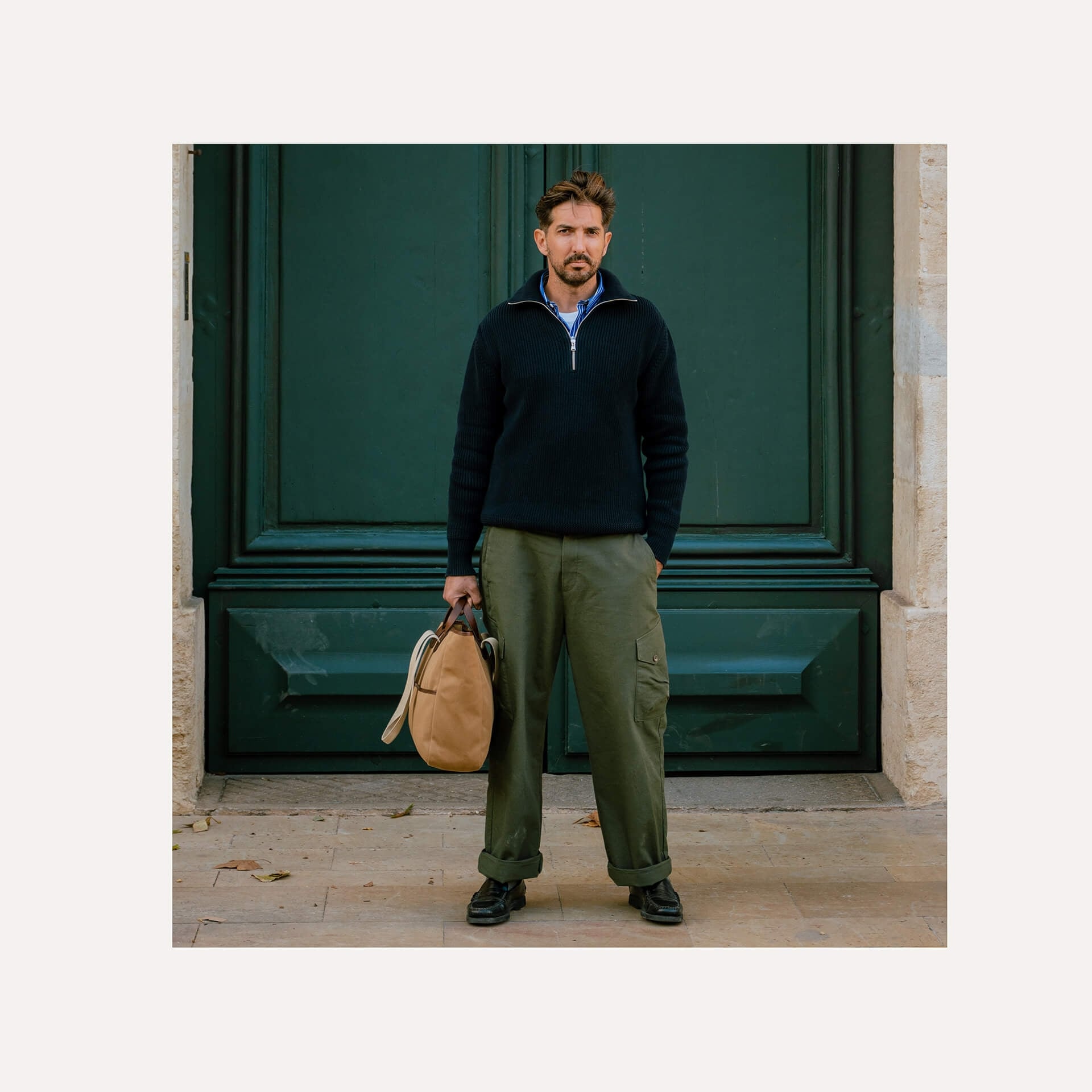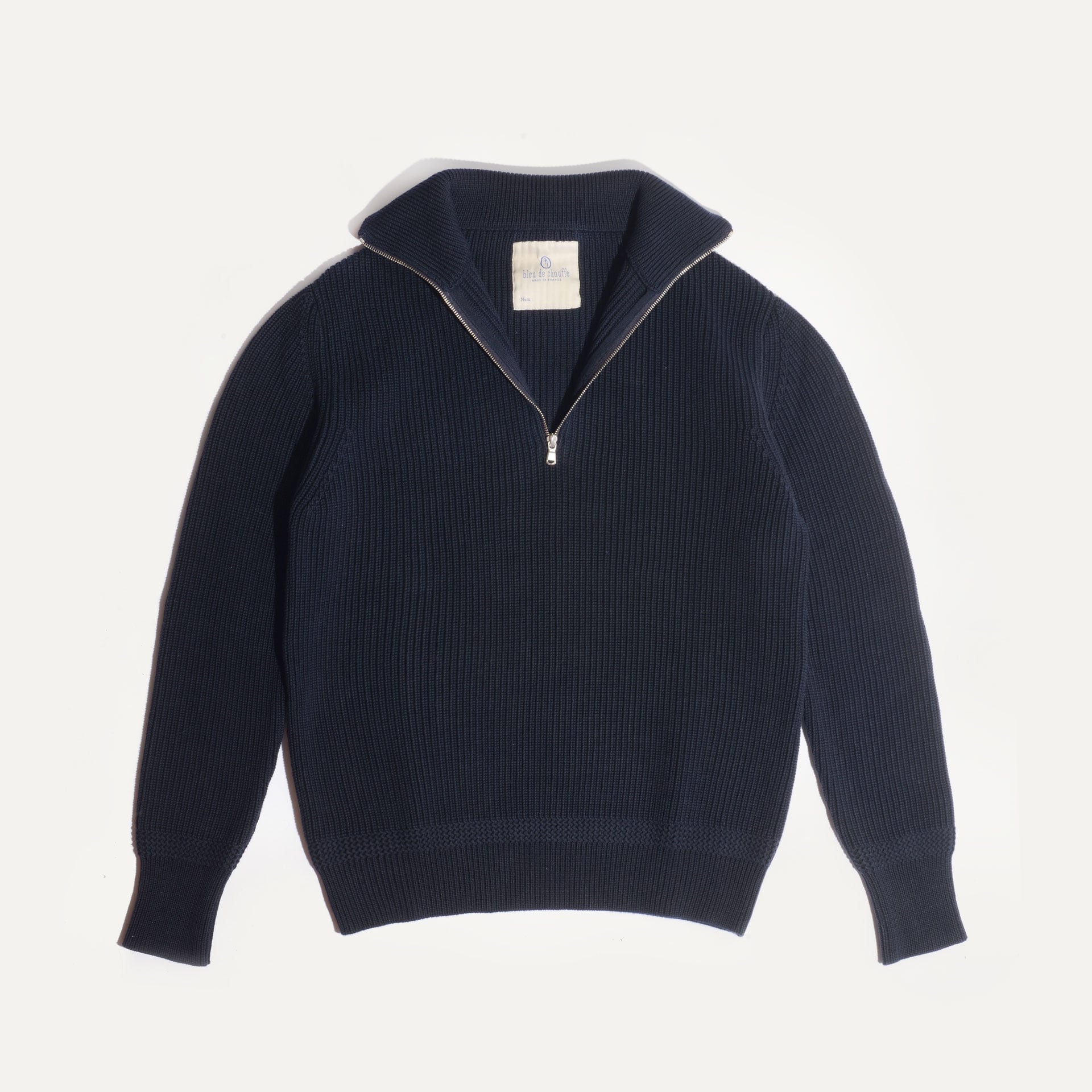 Pull homme Sauzon par Bleu de Chauffe : col zippé, maille perlée, made in France. Confort, style casual chic et authenticité au quotidien.