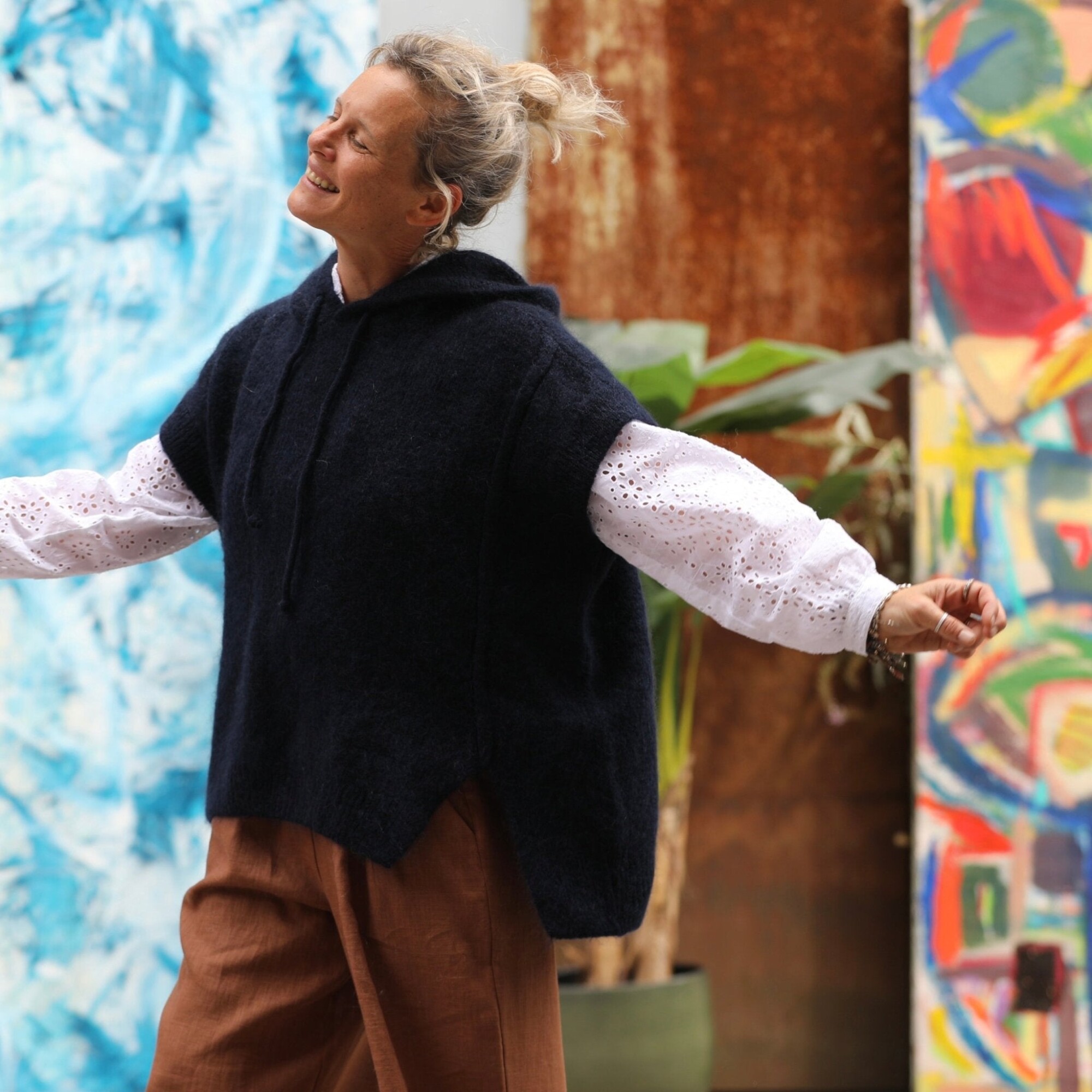 Calypso est un pull ample sans manches au style enveloppant, enrichi d’une capuche dotée d’un lien tricoté ton sur ton. Deux fentes sur le devant favorisent une belle ampleur, tandis que le dos, légèrement prolongé par rapport au devant, souligne une silhouette fluide inspirée du poncho.