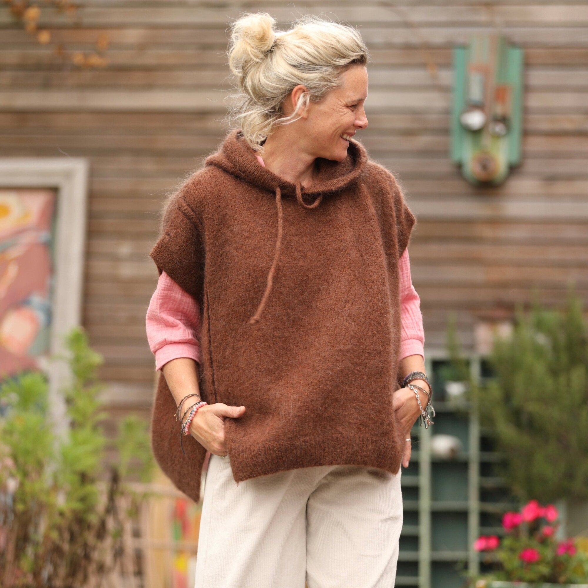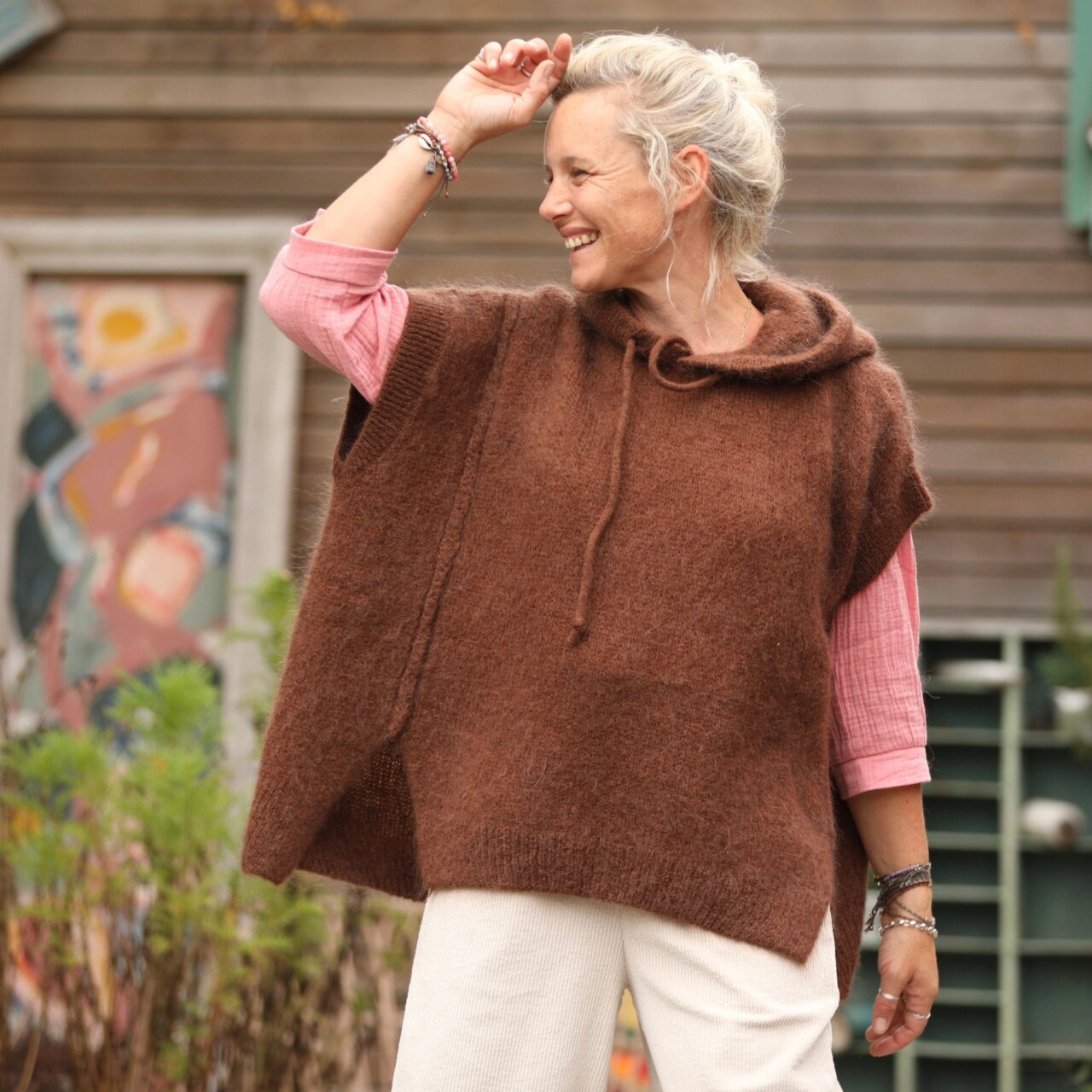 Calypso est un pull ample sans manches au style enveloppant, enrichi d’une capuche dotée d’un lien tricoté ton sur ton. Deux fentes sur le devant favorisent une belle ampleur, tandis que le dos, légèrement prolongé par rapport au devant, souligne une silhouette fluide inspirée du poncho.