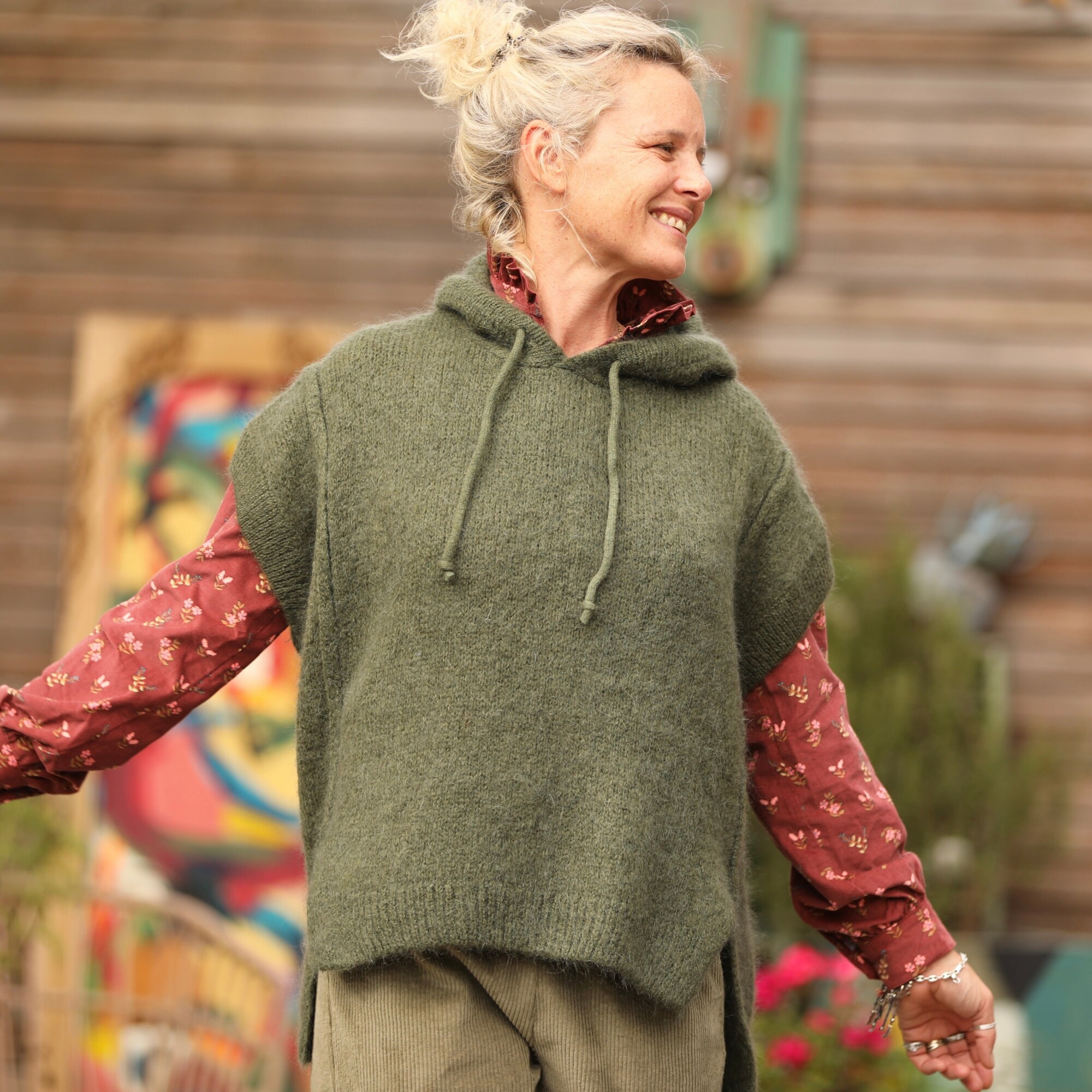 Calypso est un pull ample sans manches au style enveloppant, enrichi d’une capuche dotée d’un lien tricoté ton sur ton. Deux fentes sur le devant favorisent une belle ampleur, tandis que le dos, légèrement prolongé par rapport au devant, souligne une silhouette fluide inspirée du poncho.
