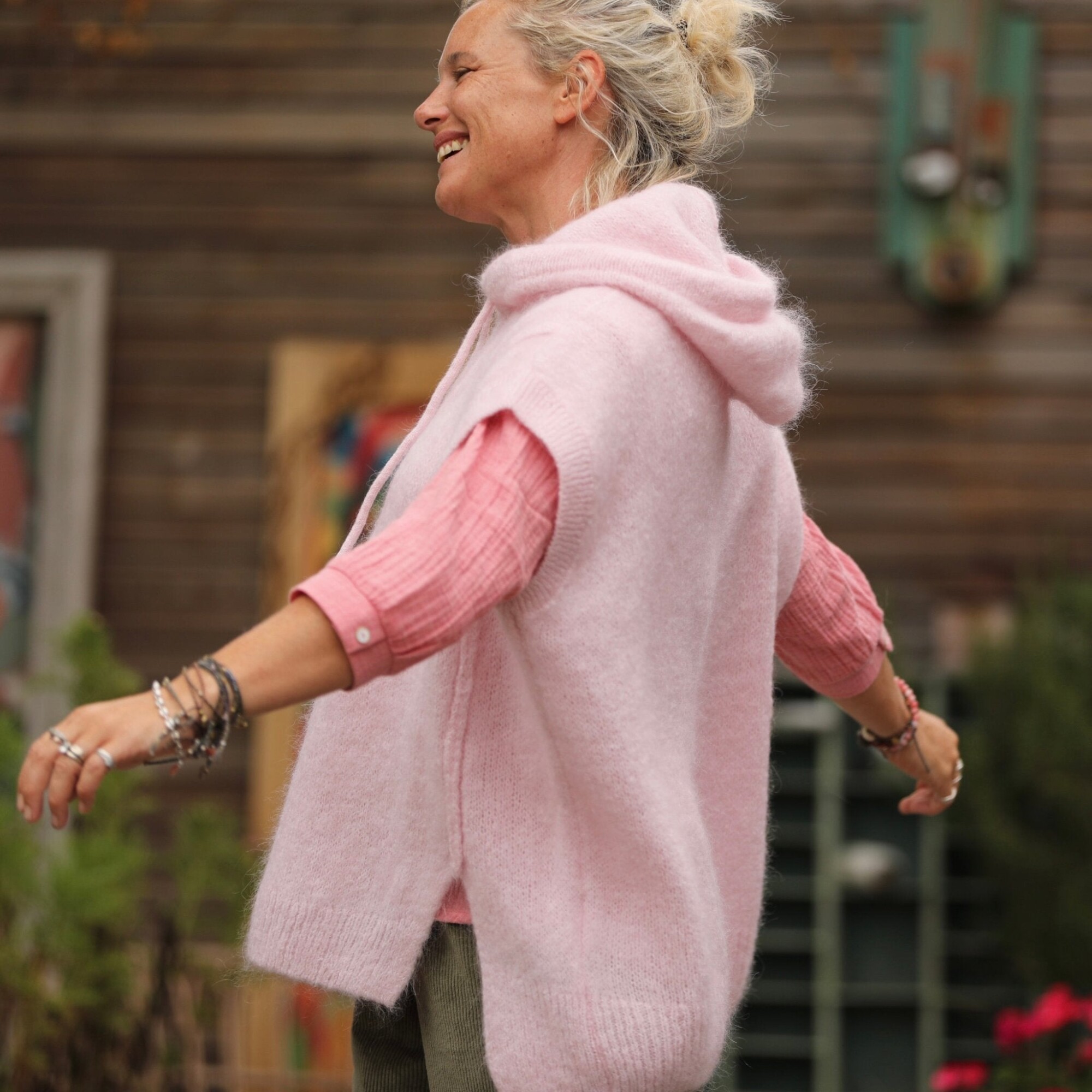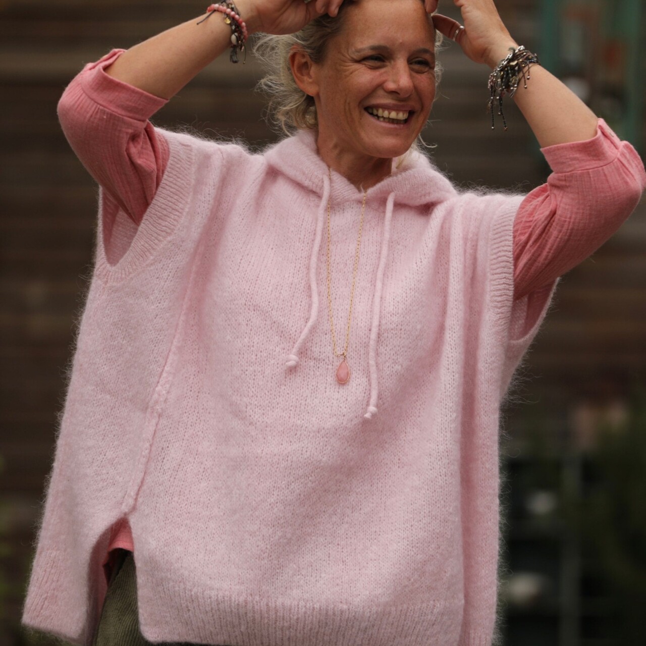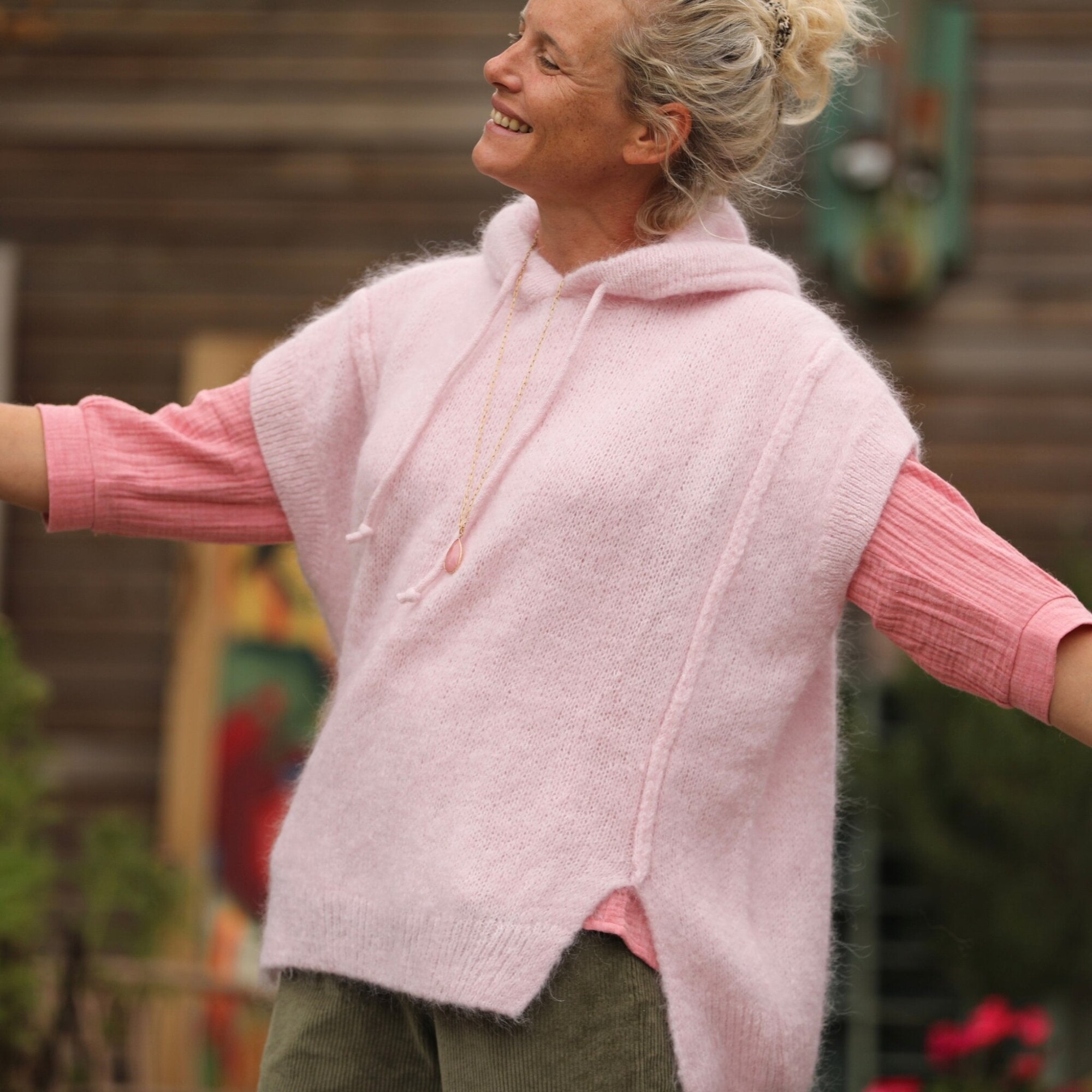 Calypso est un pull ample sans manches au style enveloppant, enrichi d’une capuche dotée d’un lien tricoté ton sur ton. Deux fentes sur le devant favorisent une belle ampleur, tandis que le dos, légèrement prolongé par rapport au devant, souligne une silhouette fluide inspirée du poncho.