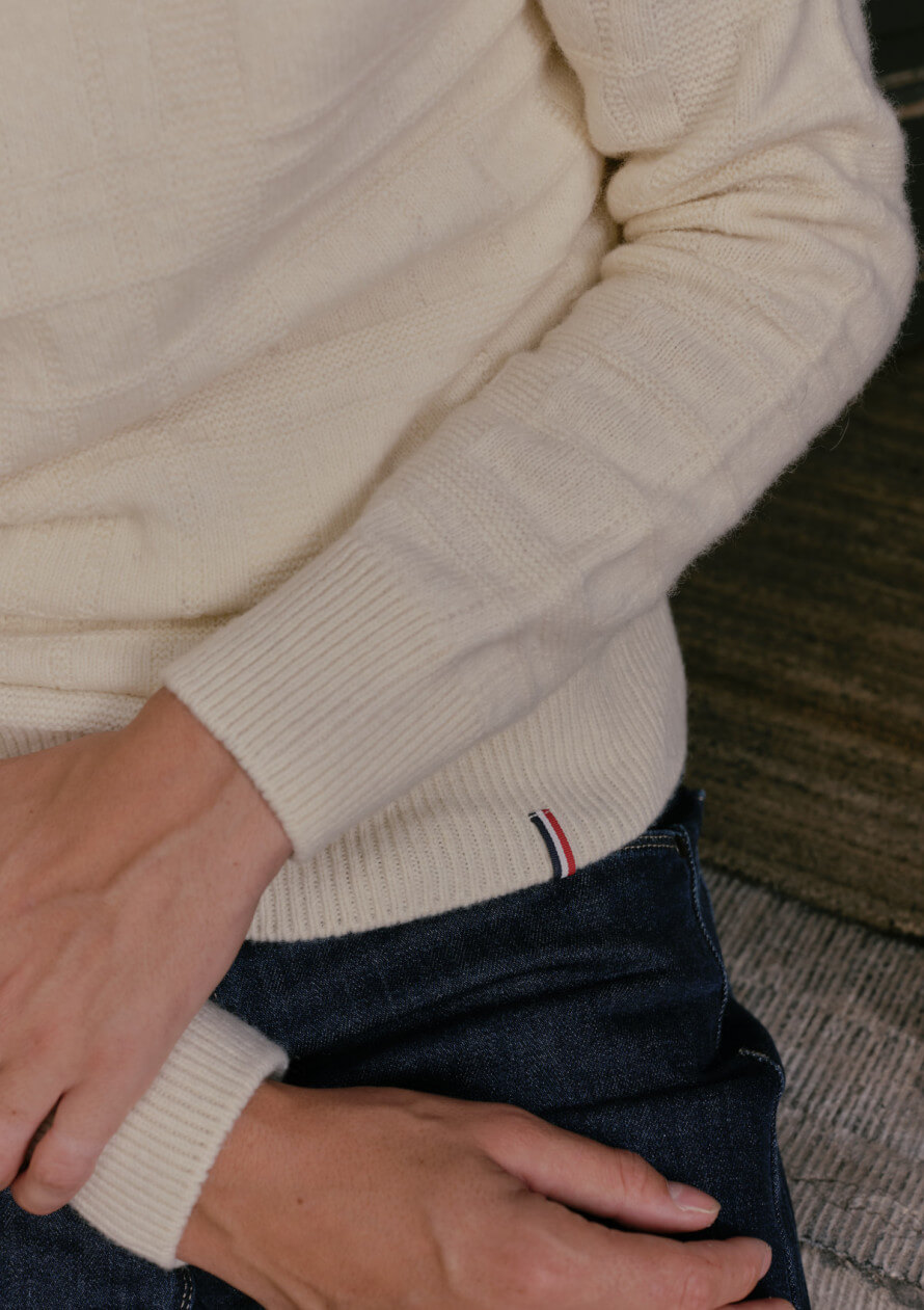 Détails : Pull col rond Motif de maille en tartan Jauge 8 Fil recyclé certifié Global Recycled Standard Fil français réalisé par une Entreprise du Patrimoine Vivant Coloration réalisée sans teinture Tricotage 3D sans coutures Technologie 0 déchet Fabriqué en France Notre mannequin porte une taille M et mesure 1,89m Emballages et packagings éco-conçus Conseils d'entretien : Nous vous conseillons de laver votre pull en lavage délicat à 30°C ou en programme laine, et de ne pas le placer au sèche-linge. Privilégiez un séchage à plat et un repassage sur l'envers.