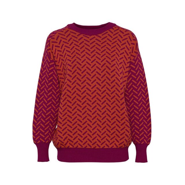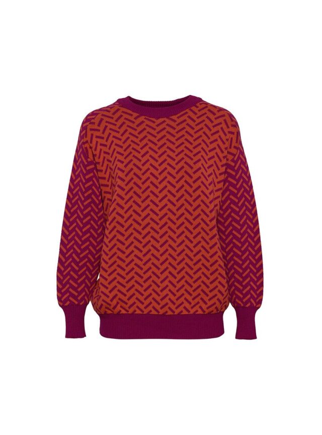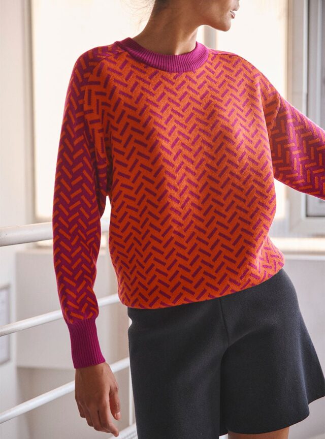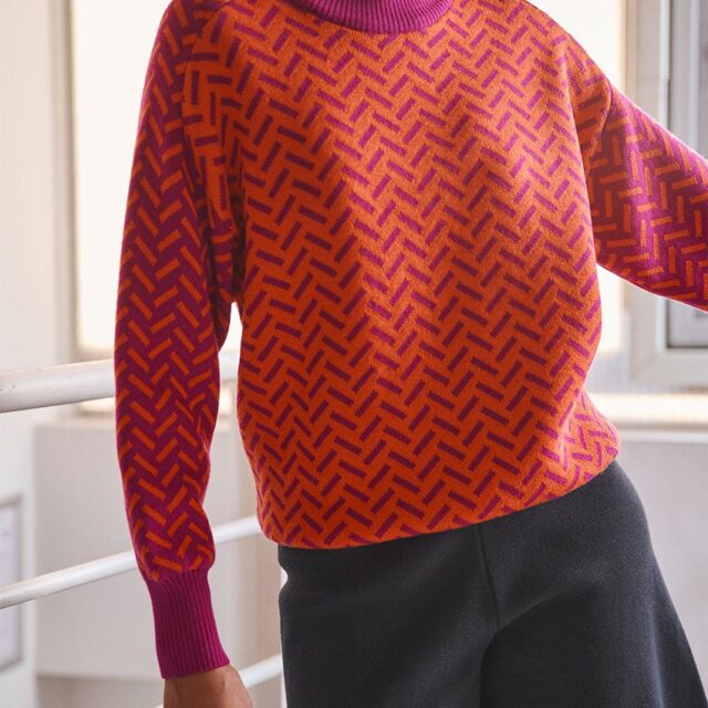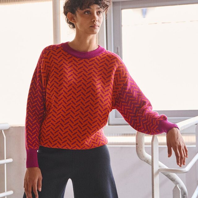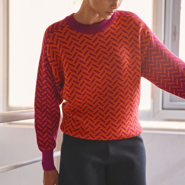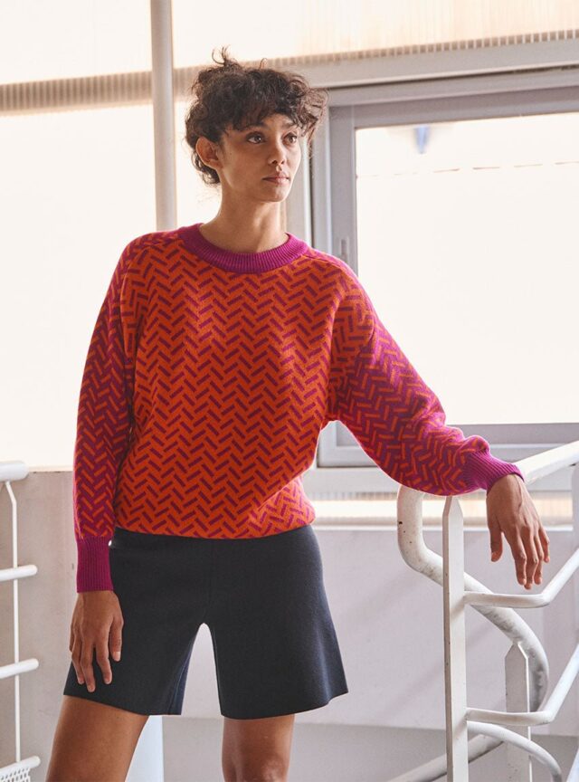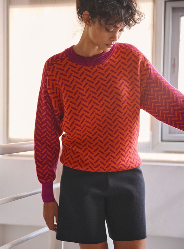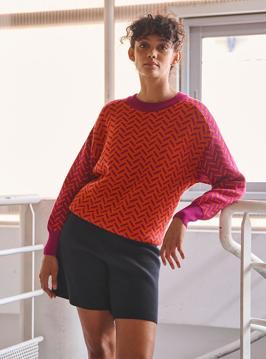 Pull jacquard bicolore col rond orange fruité en laine mérinos.
