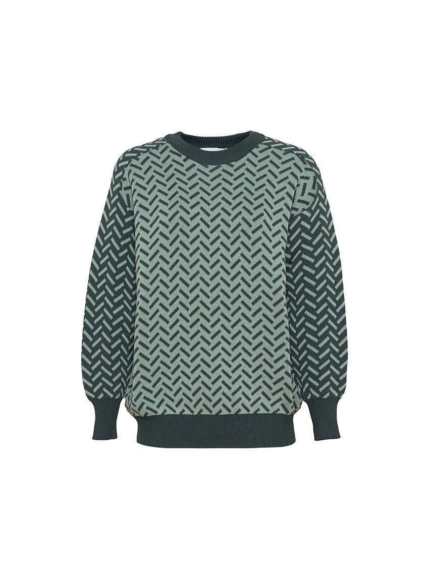 Pull jacquard bicolore col rond vert sauge en laine mérinos.