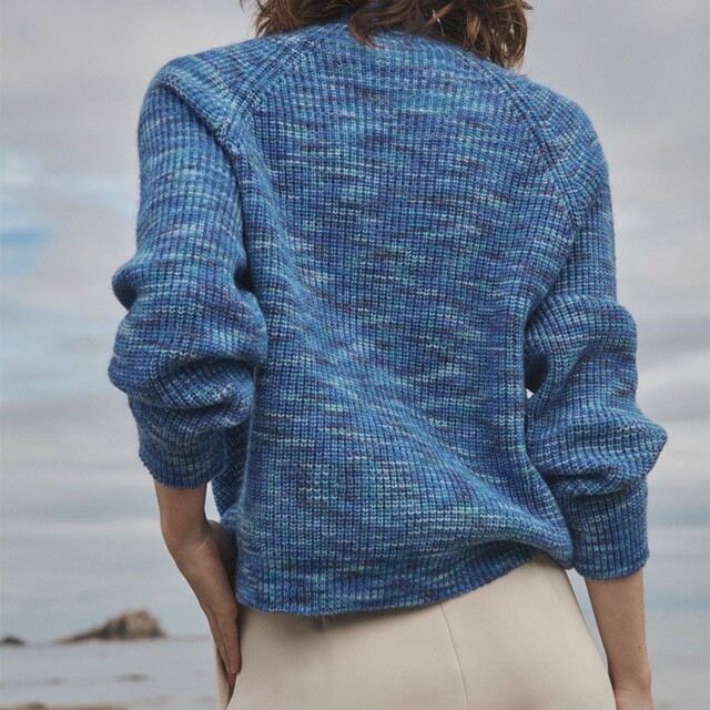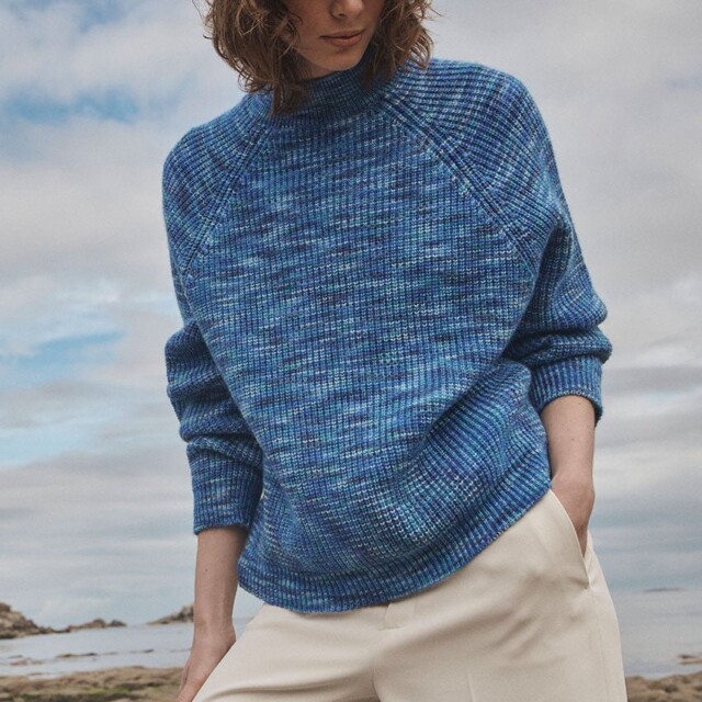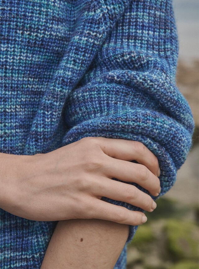 Le pull Clara en bleu pixel séduit par son volume enveloppant et son effet moiré unique. Tricoté en maille perlée avec des emmanchures raglan et un col montant en côtes 1x1, il offre chaleur, douceur et texture. Son mélange de mohair apporte un toucher nuageux et un rendu vibrant. Parfaitement assorti au bonnet Chantal et à l’écharpe Camélia, il compose un ensemble aussi cosy que lumineux.