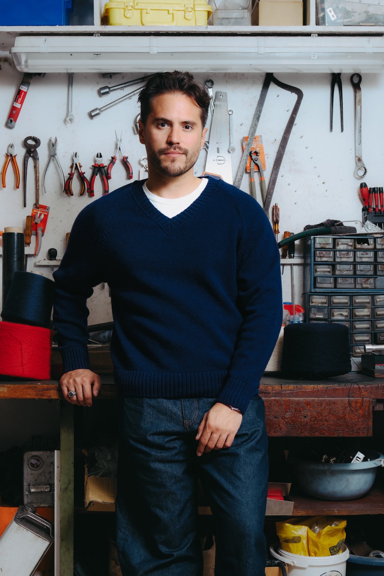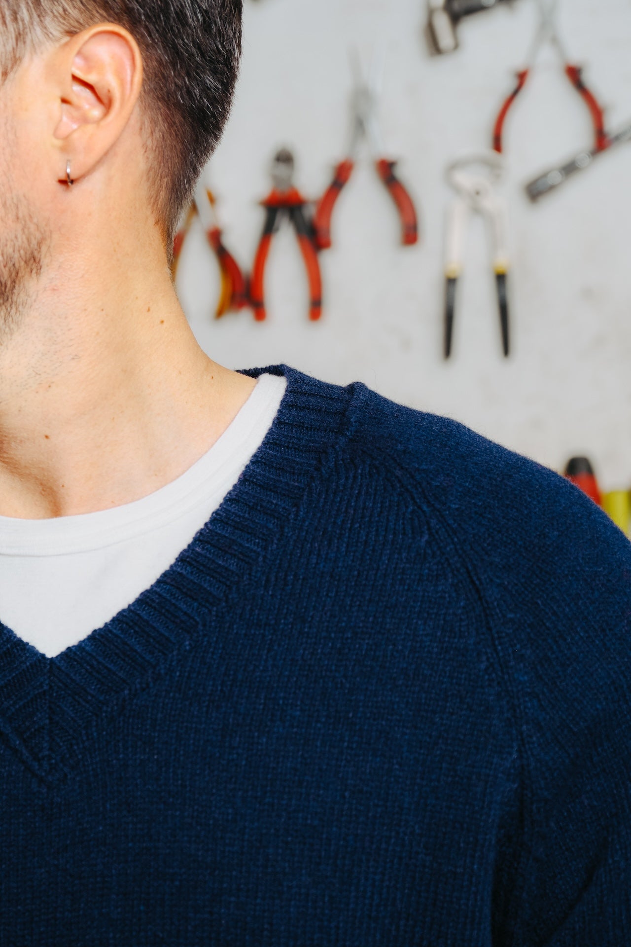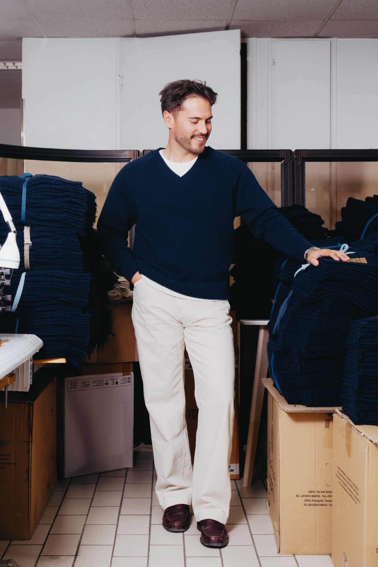 Le pull Newman est inspiré de ... Paul Newman. On l'a souvent vu en photo avec de très jolis pulls col V et c'est ce que l'on a voulu faire avec Luca. Pour ça, il nous fallait un fil épais, mais pas trop lourd. Une taille d'aiguille moyenne afin de tricoter une maille épaisse mais pas trop et de trouver la forme idéale pour faire d'un pull ancien quelque chose de contemporain. Aussi on voulait un pull avec un col prédominant, qui soit l'un des caractères importants de la pièce. On a donc choisi un fil cardé dans des matières entièrement recyclées. On travaille depuis quelques temps avec un filateur français qui s'appelle Filature du parc, qui est situé à Brassac dans le Tarn depuis 1975. Et nous achetons ce fil depuis 3 ans, pour lequel nous avons de bons retours. Ce fil est entièrement recyclé, il est composé à 70% de laine recyclée afin d'apporter de la chaleur, 25% de polyamide recyclé pour apporter de la solidité au fil et 5% d'autres fibres car lorsque l’on fait un fil recyclé, il peut y avoir d’autres matières minuscules qui se mélangent et pour un souci de clarté nous mettons la dénomination autres fibres pour les 5% restants. On est allés le tricoter en jauge 5, donc une maille pas trop épaisse mais pas trop fine, afin d'avoir une bonne main légère mais un pull aéré / flottant, un toucher sec et rustique car ça reste un pull emblématique voire historique. Le tricotage entièrement en diminué dessinant ces manches raglantes épouse parfaitement le haut du corps, et notamment enlève toutes les démarcations possibles au niveau des épaules. Ce qui est bien dans les collaborations c'est que l'on peut partir sur d'autres styles qu'à notre habitude. Cette forme boxy choisie avec Luca, nous fait sortir de nos standards sans se dénaturer complètement. Col V imposant Manches raglant, entièrement en diminution Forme boxy Tricotage jauge 5, maille jersey Fil : 70% laine recyclée, 25% polyamide recyclé, 5% autres fibres Toucher sec et rustique