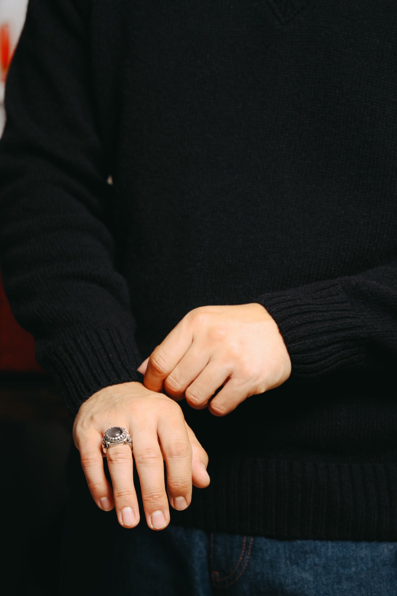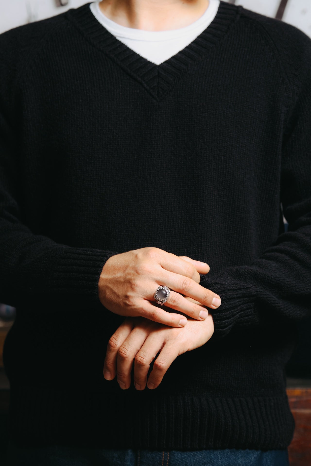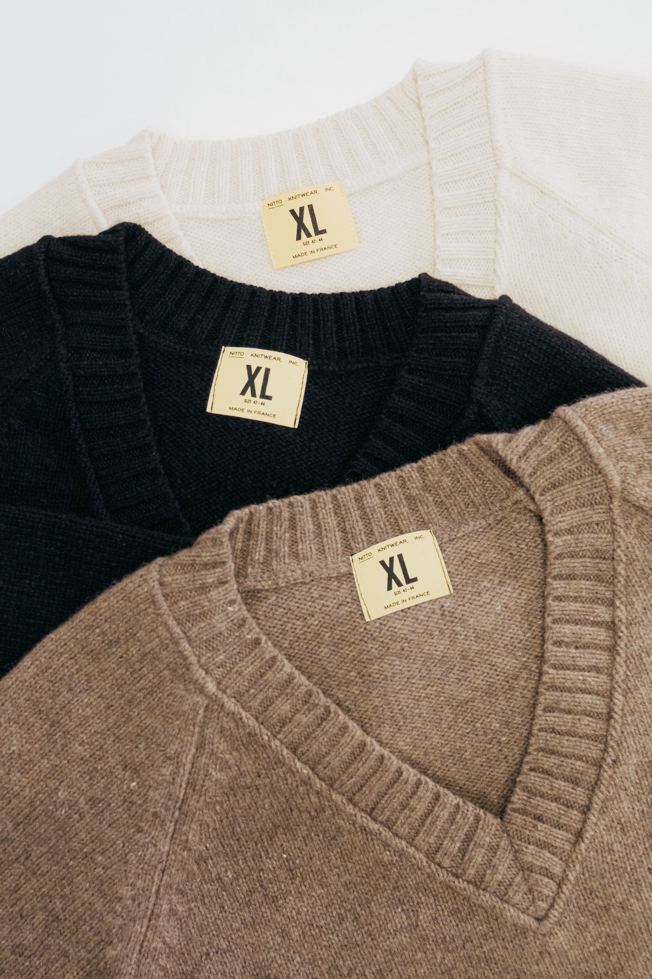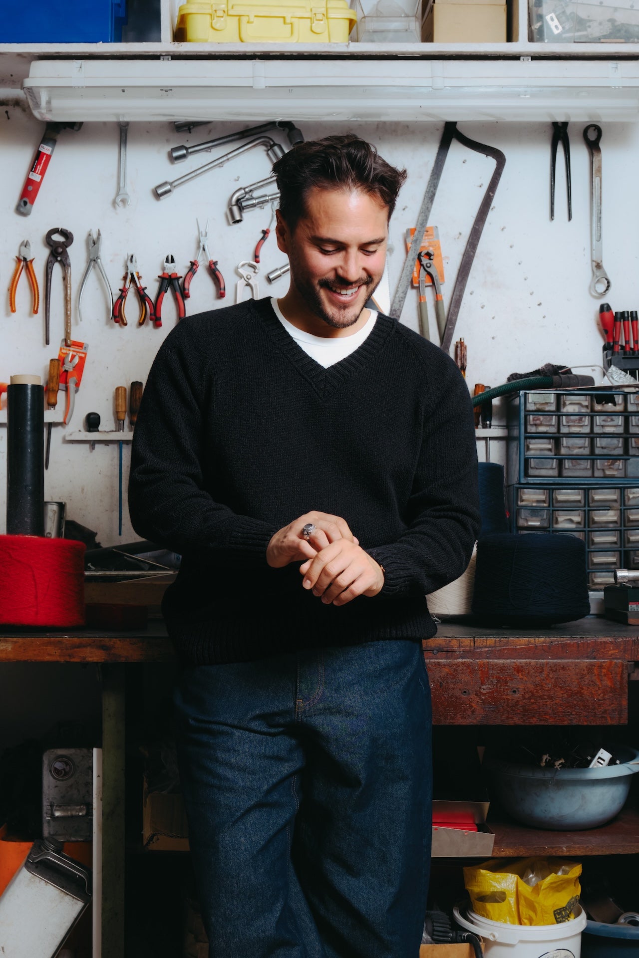 Le pull Newman est inspiré de ... Paul Newman. On l'a souvent vu en photo avec de très jolis pulls col V et c'est ce que l'on a voulu faire avec Luca. Pour ça, il nous fallait un fil épais, mais pas trop lourd. Une taille d'aiguille moyenne afin de tricoter une maille épaisse mais pas trop et de trouver la forme idéale pour faire d'un pull ancien quelque chose de contemporain. Aussi on voulait un pull avec un col prédominant, qui soit l'un des caractères importants de la pièce. On a donc choisi un fil cardé dans des matières entièrement recyclées. On travaille depuis quelques temps avec un filateur français qui s'appelle Filature du parc, qui est situé à Brassac dans le Tarn depuis 1975. Et nous achetons ce fil depuis 3 ans, pour lequel nous avons de bons retours. Ce fil est entièrement recyclé, il est composé à 70% de laine recyclée afin d'apporter de la chaleur, 25% de polyamide recyclé pour apporter de la solidité au fil et 5% d'autres fibres car lorsque l’on fait un fil recyclé, il peut y avoir d’autres matières minuscules qui se mélangent et pour un souci de clarté nous mettons la dénomination autres fibres pour les 5% restants. On est allés le tricoter en jauge 5, donc une maille pas trop épaisse mais pas trop fine, afin d'avoir une bonne main légère mais un pull aéré / flottant, un toucher sec et rustique car ça reste un pull emblématique voire historique. Le tricotage entièrement en diminué dessinant ces manches raglantes épouse parfaitement le haut du corps, et notamment enlève toutes les démarcations possibles au niveau des épaules. Ce qui est bien dans les collaborations c'est que l'on peut partir sur d'autres styles qu'à notre habitude. Cette forme boxy choisie avec Luca, nous fait sortir de nos standards sans se dénaturer complètement. Col V imposant Manches raglant, entièrement en diminution Forme boxy Tricotage jauge 5, maille jersey Fil : 70% laine recyclée, 25% polyamide recyclé, 5% autres fibres Toucher sec et rustique