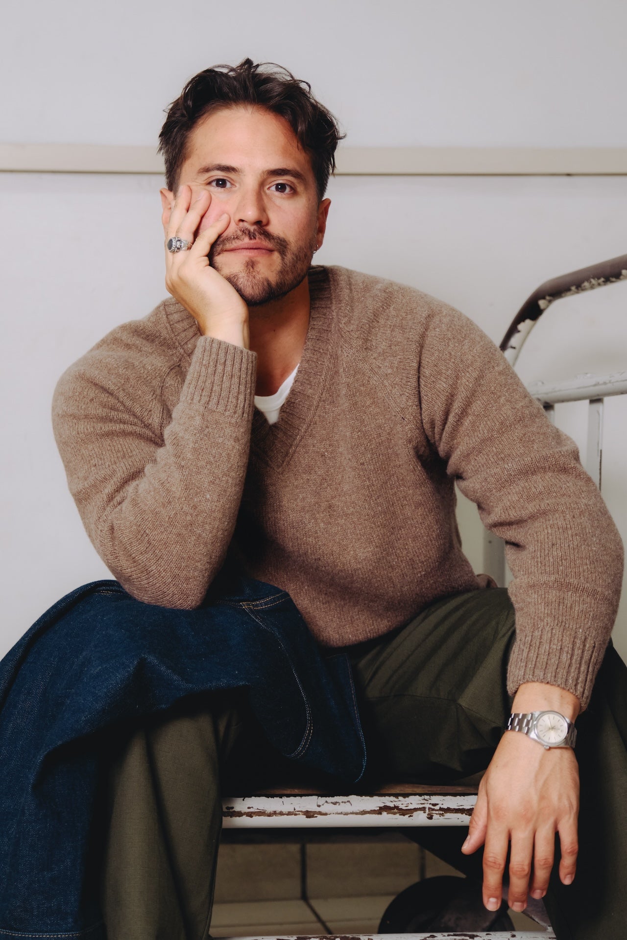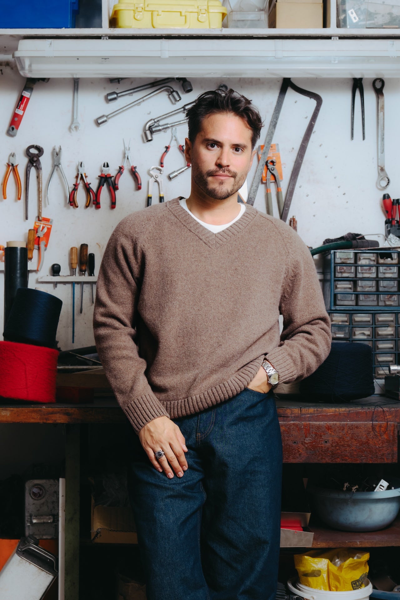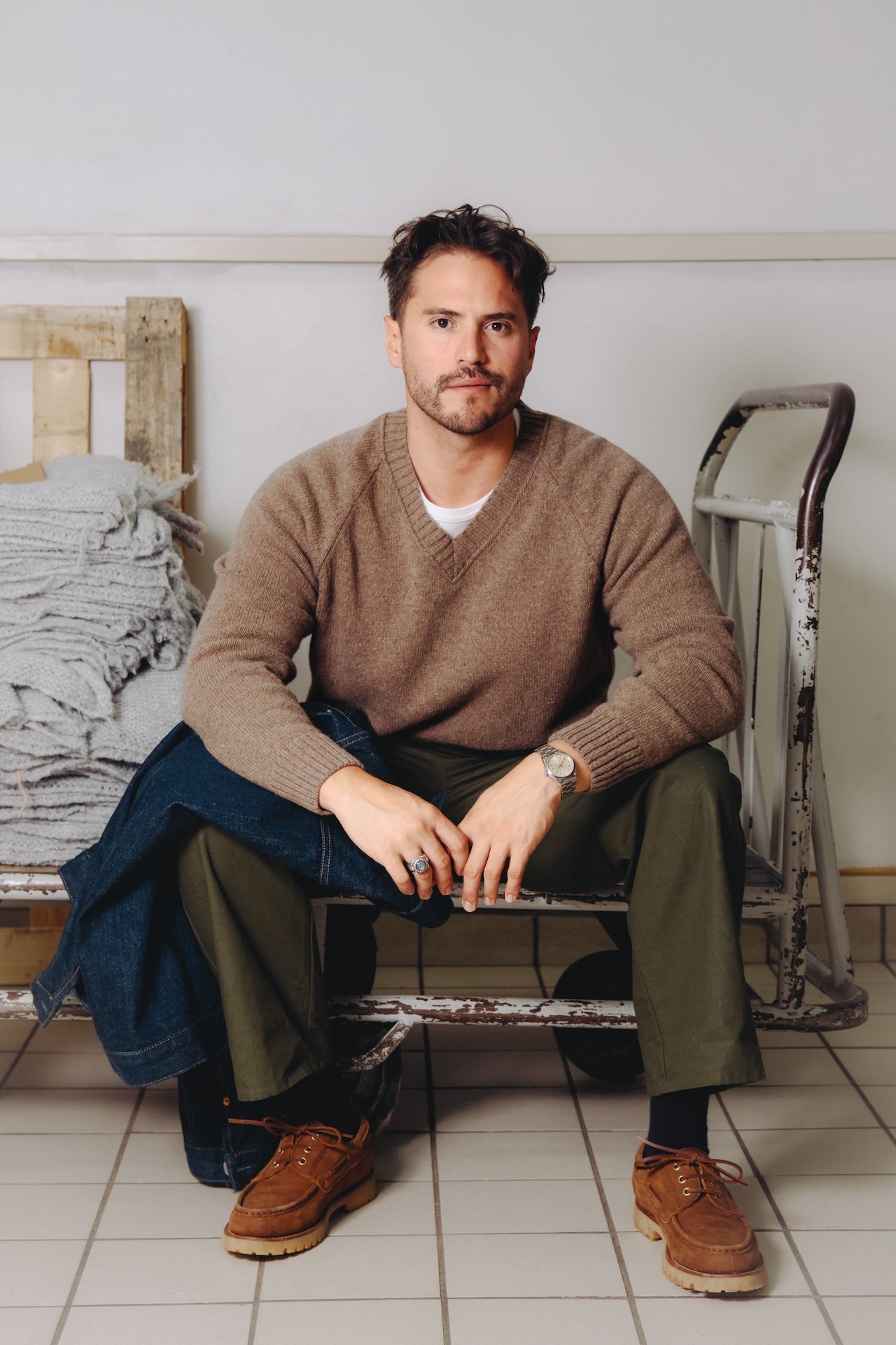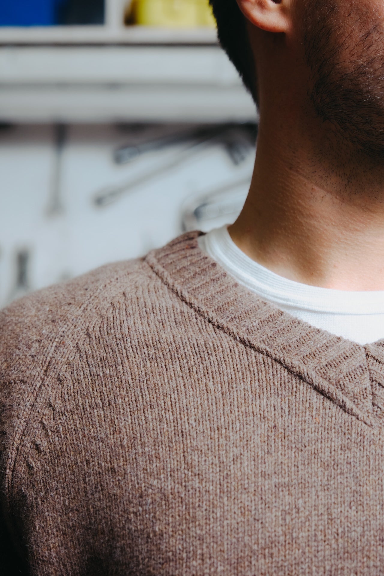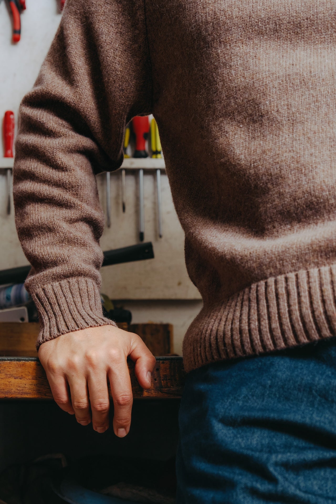 Le pull Newman est inspiré de ... Paul Newman. On l'a souvent vy en photo avec de très jolis pulls col V et c'est ce que l'on a voulu faire avec Luca. Pour ça, il nous fallait un fil épais, mais pas trop lourd. Une taille d'aiguille moyenne afin de tricoter une maille épaisse mais pas trop et de trouver la forme idéale pour faire d'un pull ancien quelque chose de contemporain. Aussi on voulait un pull avec un col prédominant, qui soit l'un des caractères importants de la pièce. On a donc choisi un fil cardé dans des matières entièrement recyclées. On travaille depuis quelques temps avec un filateur français qui s'appelle Filature du parc, qui est situé à Brassac dans le Tarn depuis 1975. Et nous achetons ce fil depuis 3 ans, pour lequel nous avons de bons retours. Ce fil est entièrement recyclé, il est composé à 70% de laine recyclée afin d'apporter de la chaleur, 25% de polyamide recyclé pour apporter de la solidité au fil et 5% d'autres fibres car lorsque l’on fait un fil recyclé, il peut y avoir d’autres matières minuscules qui se mélangent et pour un souci de clarté nous mettons la dénomination autres fibres pour les 5% restants. On est allés le tricoter en jauge 5, donc une maille pas trop épaisse mais pas trop fine, afin d'avoir une bonne main légère mais un pull aéré / flottant, un toucher sec et rustique car ça reste un pull emblématique voire historique. Le tricotage entièrement en diminué dessinant ces manches raglantes épouse parfaitement le haut du corps, et notamment enlève toutes les démarcations possibles au niveau des épaules. Ce qui est bien dans les collaborations c'est que l'on peut partir sur d'autres styles qu'à notre habitude. Cette forme boxy choisie avec Luca, nous fait sortir de nos standards sans se dénaturer complètement. Col V imposant Manches raglant, entièrement en diminution Forme boxy Tricotage jauge 5, maille jersey Fil : 70% laine recyclée, 25% polyamide recyclé, 5% autres fibres Toucher sec et rustique