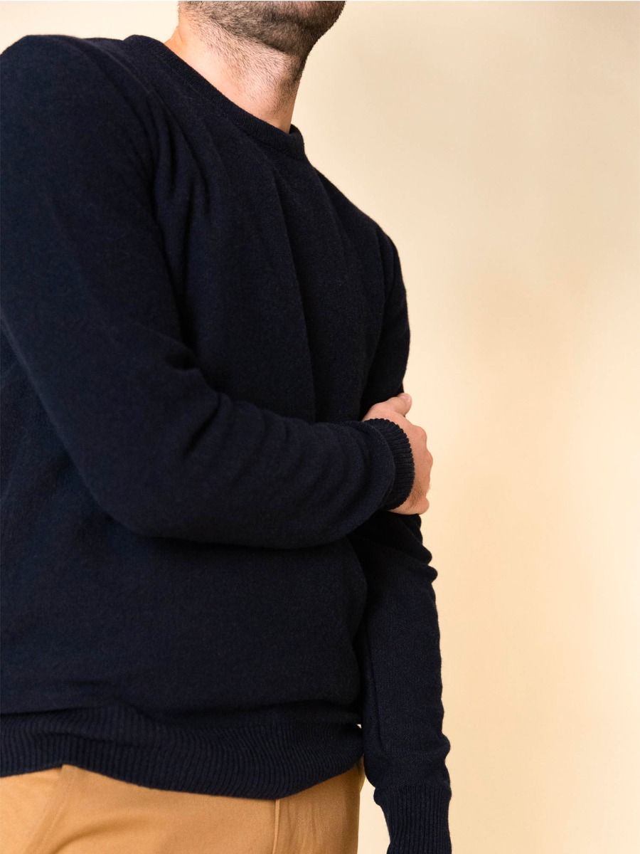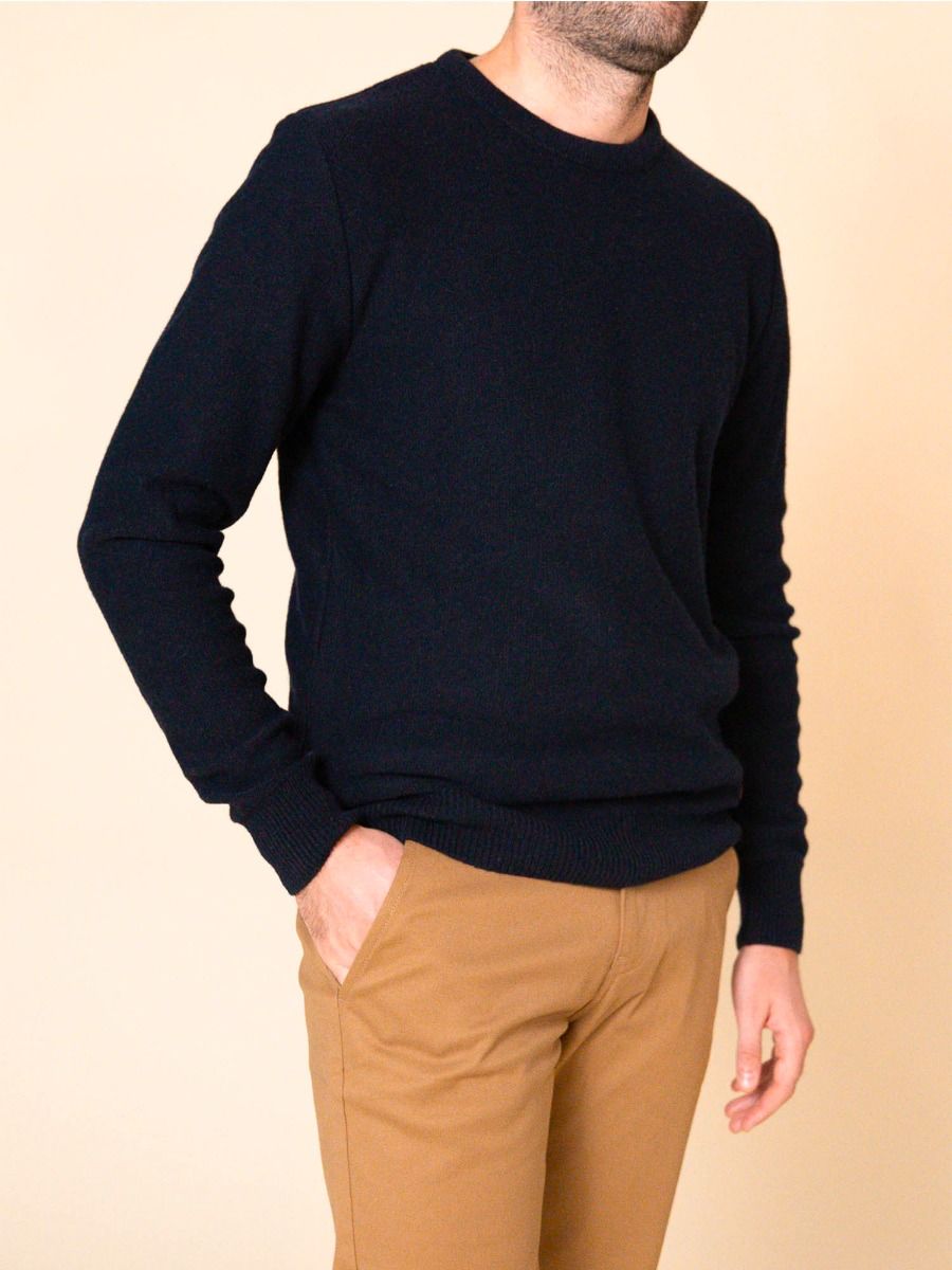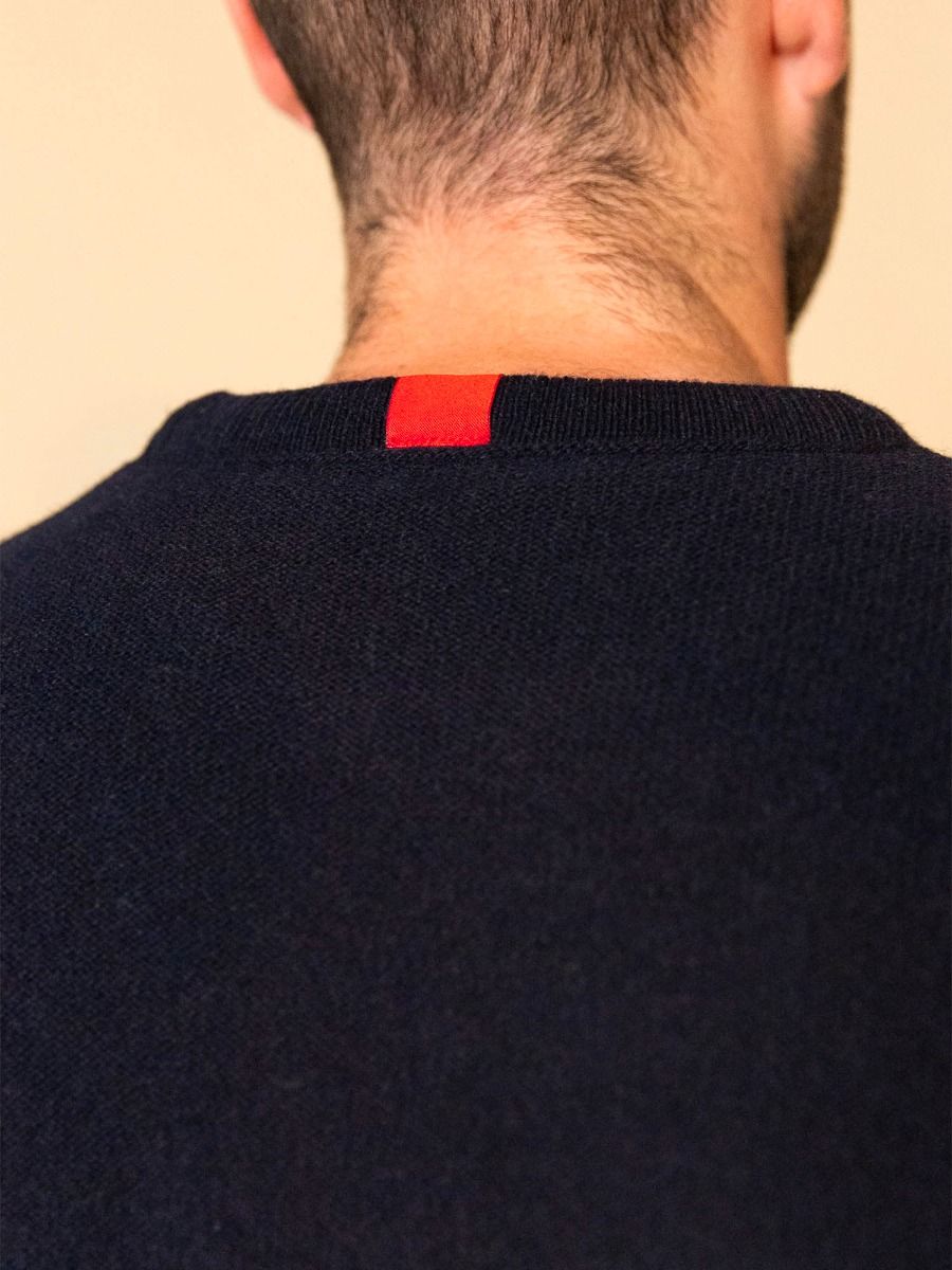 LE PULL BLEU RECYCLÉ FRANÇAIS Ce pull bleu pour homme est fabriqué à partir de laine recyclée. Il est conçu en collaboration avec la Fédération Nationale des Sapeurs-Pompiers à partir de vieux uniformes de pompiers.