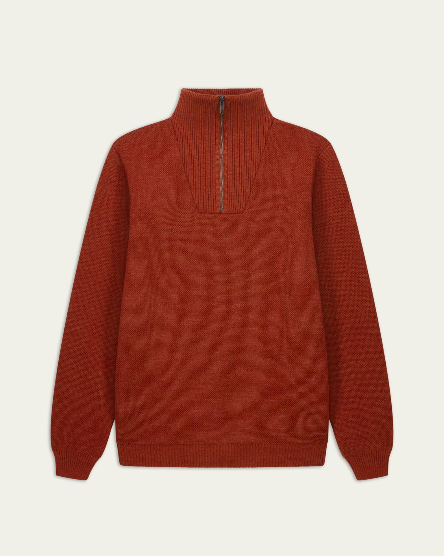 C’est le pull Youri avec un col camionneur. Un col qui monte le long de votre cou que vous allez ouvrir et fermer à l’aide d’un zip d’une qualité supérieure provenant d’un des principaux fabriquant du monde de fermetures éclairs (YKK – qualité excella). Ce zip a été fait et cousu sur la pièce dans le but de ne pas vous gêner, vous ne le sentirez pas. Un peu d’histoire : dans les années 1920, le pull camionneur était l’allié des chauffeurs routiers et des ouvriers. Pratique et fonctionnel, son col montant les protégeait du froid, tandis que le zip permettait d’ouvrir ou de refermer le col sans retirer le pull - idéal pour les changements de température entre les espaces intérieurs et extérieurs. Fil 100% laine mérinos extra-fine (19,5 microns) Tricotage maille piquée, bien serrée (jauge 14) Poignets et bas de pièces tricotés en côtes 2 x 2 Toucher doux et confortable Poids : 850 grammes