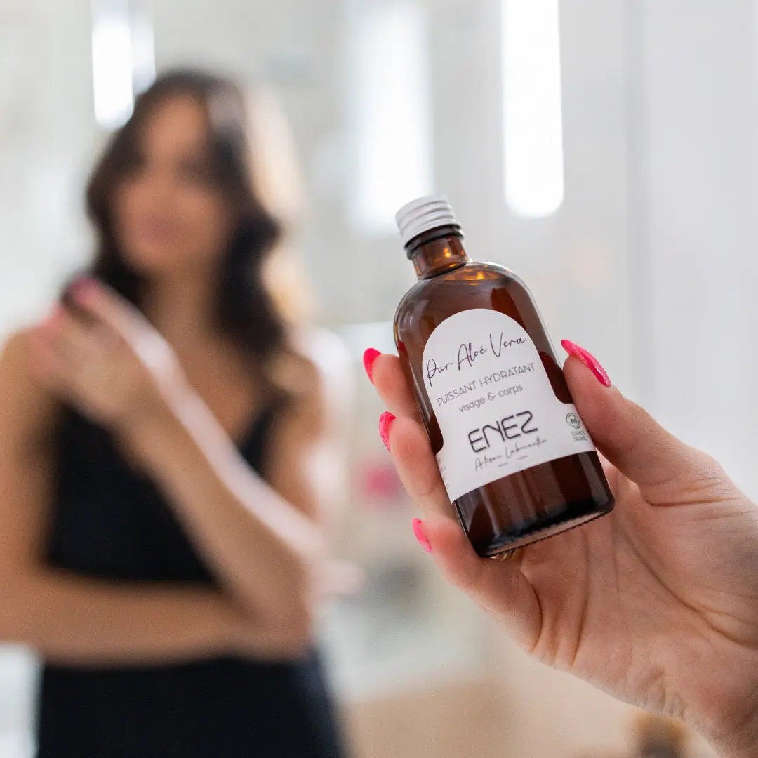 PUISSANT HYDRATANT - Visage & Corps 98,7 % PUR JUS FRAIS - LE MEILLEUR DE L’ALOÉ VERA NATIF POUR UN SOIN REPULPANT Favorise l’élimination des cellules mortes grâce aux enzymes protéolytiques qu’il contient et possède un fort pouvoir astringent (effet tenseur) dû à ses composants phénoliques (tanins). Il maintient l’hydratation de la peau grâce à sa concentration en polysaccharides qui forment une barrière retenant l’eau. Il accélère également la régénération cellulaire, notamment des cellules fibroblastes qui fabriquent le collagène.
