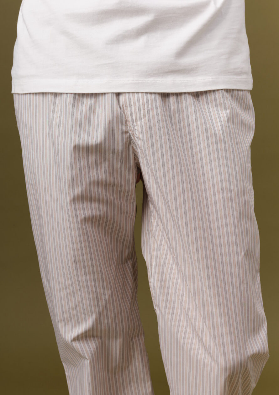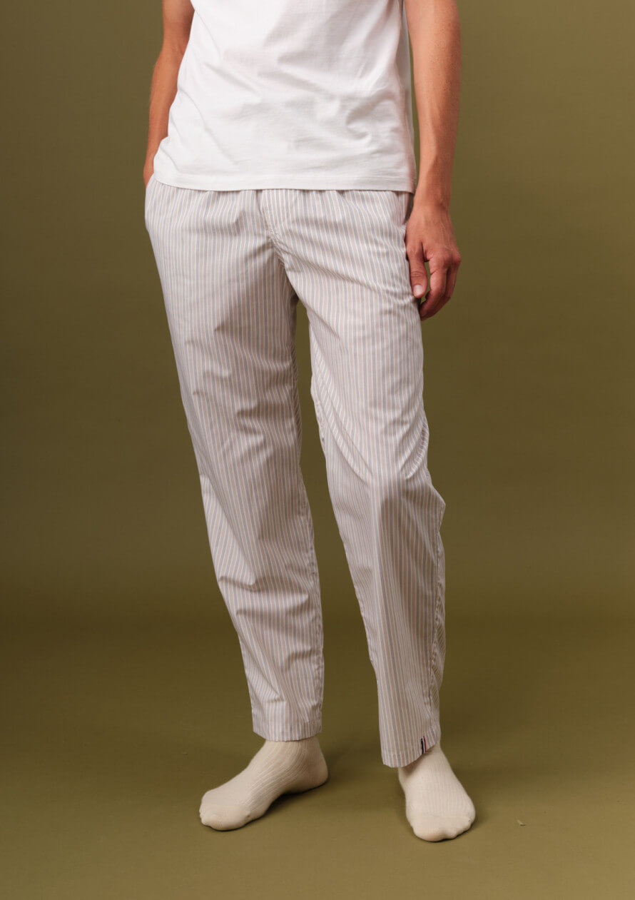 Bas de pyjama en popeline légère, rayée terracotta et noir. Ceinture élastiquée, braguette boutonnée, cordon en coton bio, poches fonctionnelles.