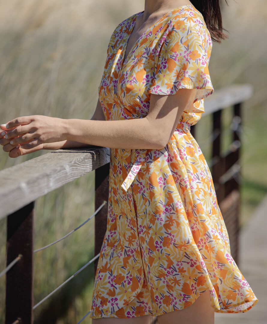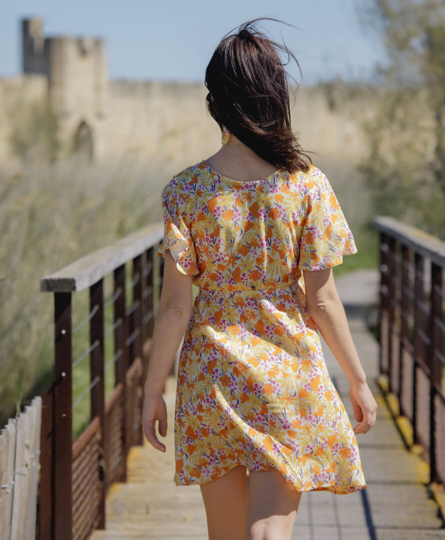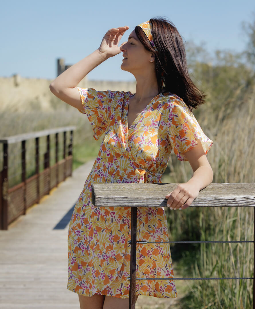Alix, notre première robe portefeuille, parfaite pour cet été ! On craque pour son tissu plein de pep's, ses manches volantées, et son attache décalée sur l'avant. Facile à porter, et à associer : veste en jean, gilet, maille.