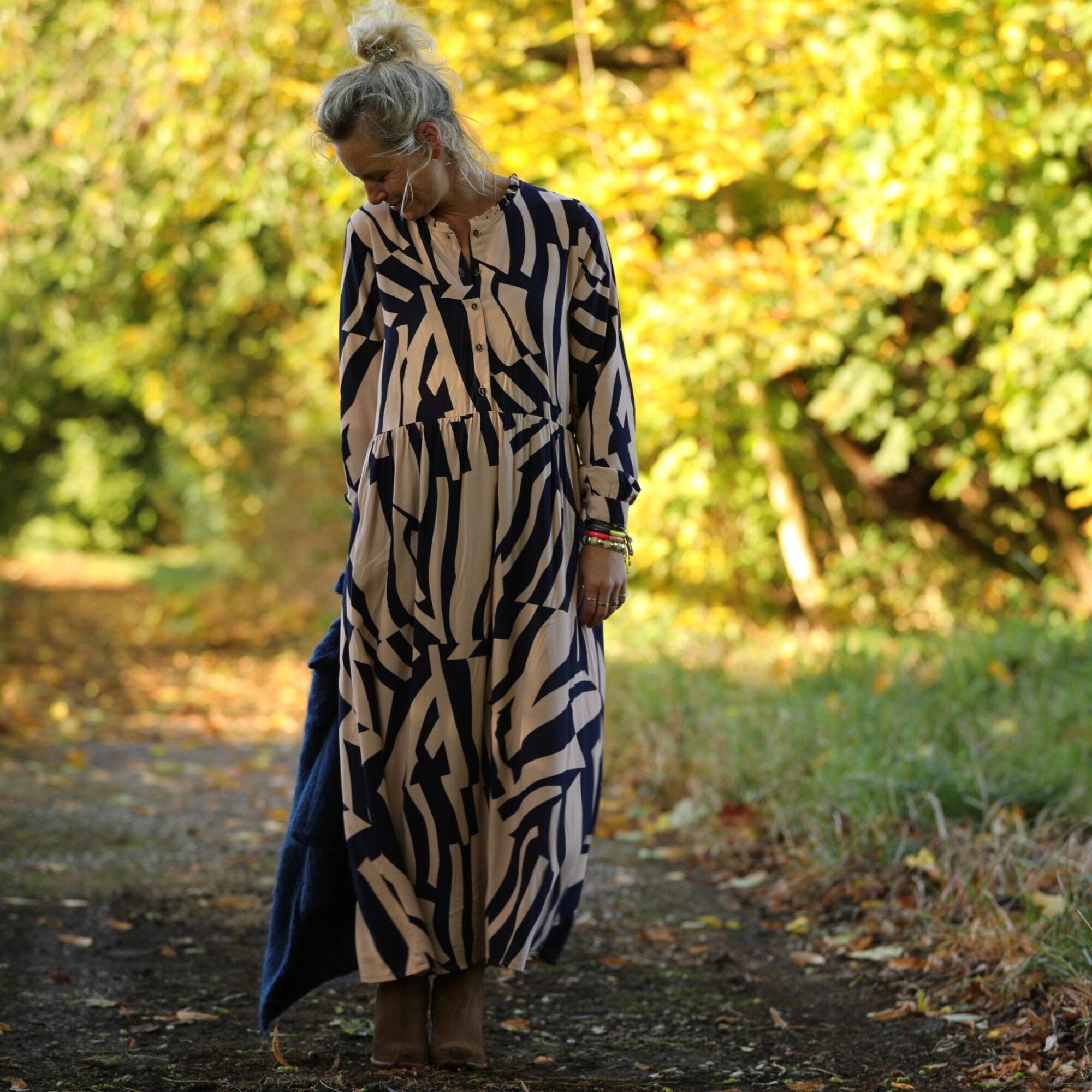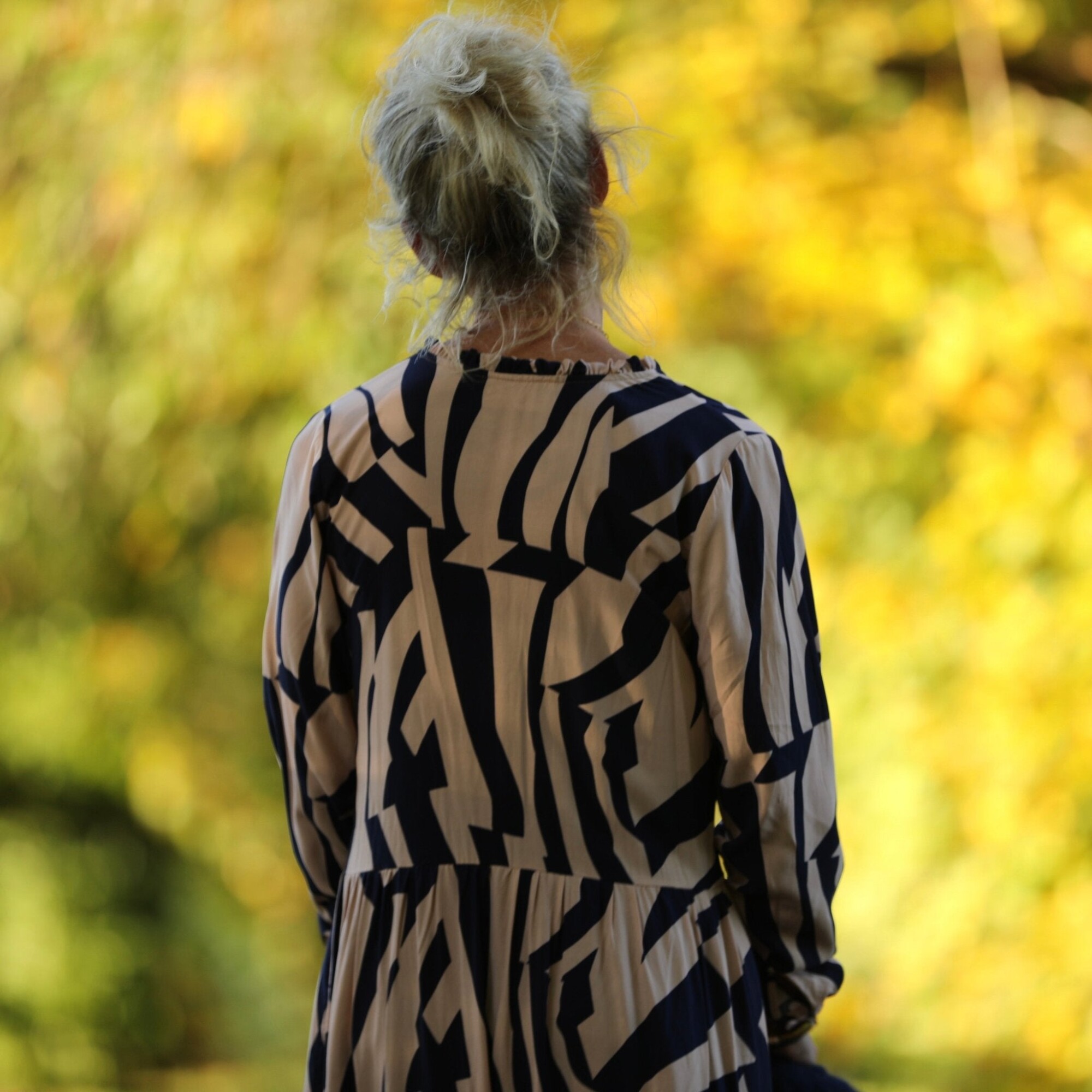 La robe Aurélia se pare d’un charme subtil dans cette version en viscose vague graphique. Sa matière fluide et légèrement satinée suit les mouvements avec élégance, tandis que son imprimé graphique délicat apporte une touche moderne et raffinée.