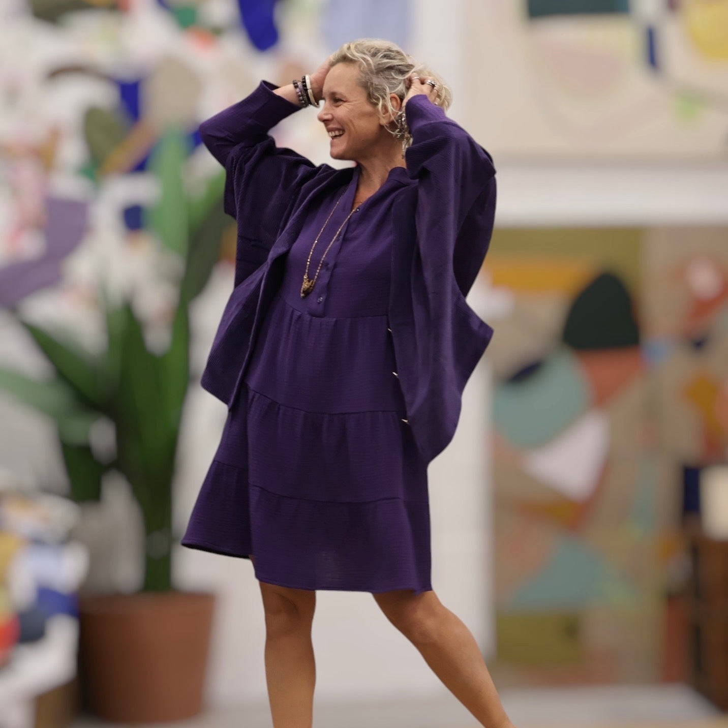 Bella incarne une élégance intemporelle, mariant harmonieusement confort et sophistication. Son style se caractérise par une jupe à étages, offrant un volume généreux dans le bas, un col mao et des manches longues.