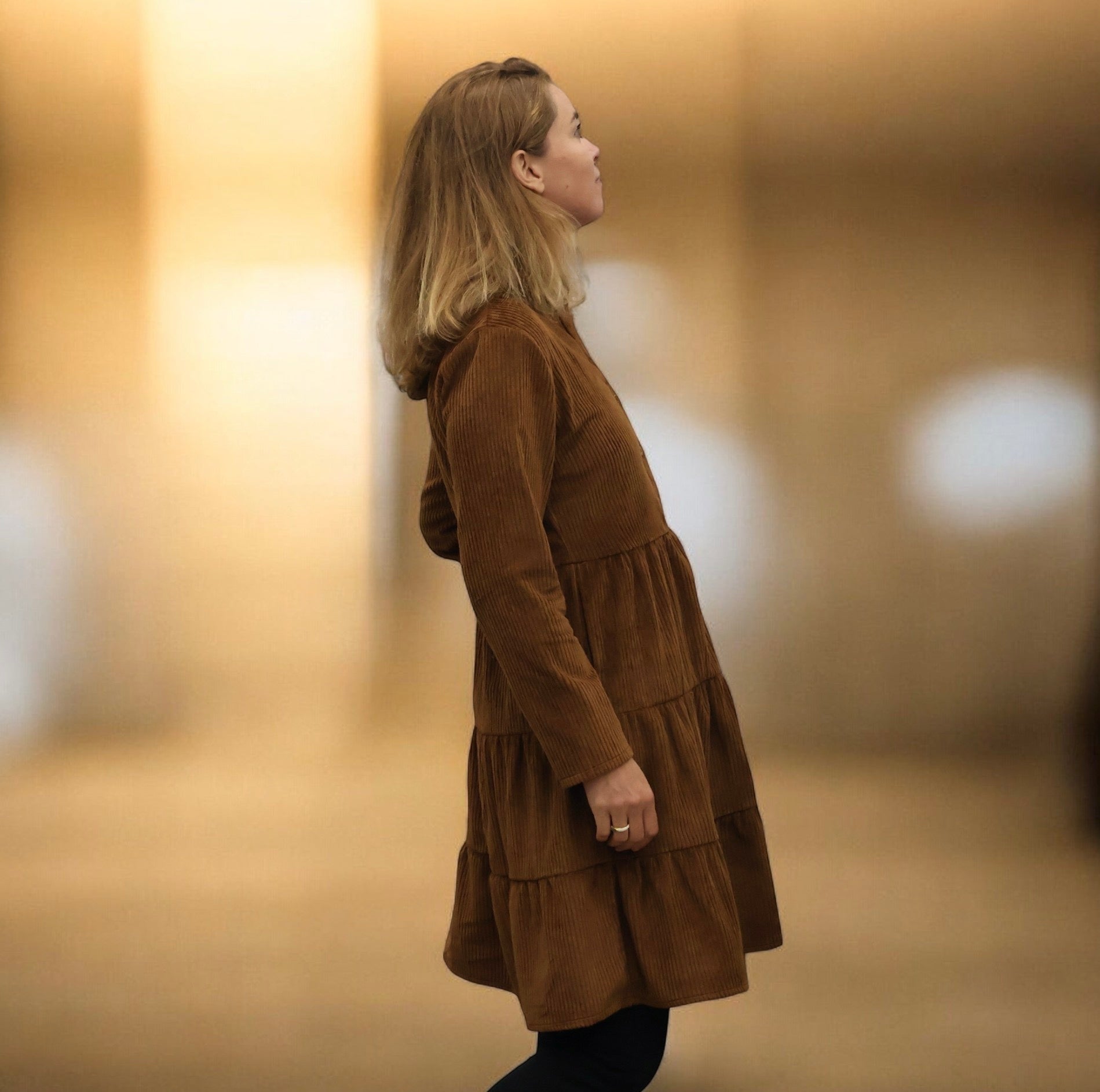 Bella incarne une élégance intemporelle, mariant harmonieusement confort et sophistication. Son style se caractérise par une jupe à étages, offrant un volume généreux dans le bas, un col mao et des manches longues.