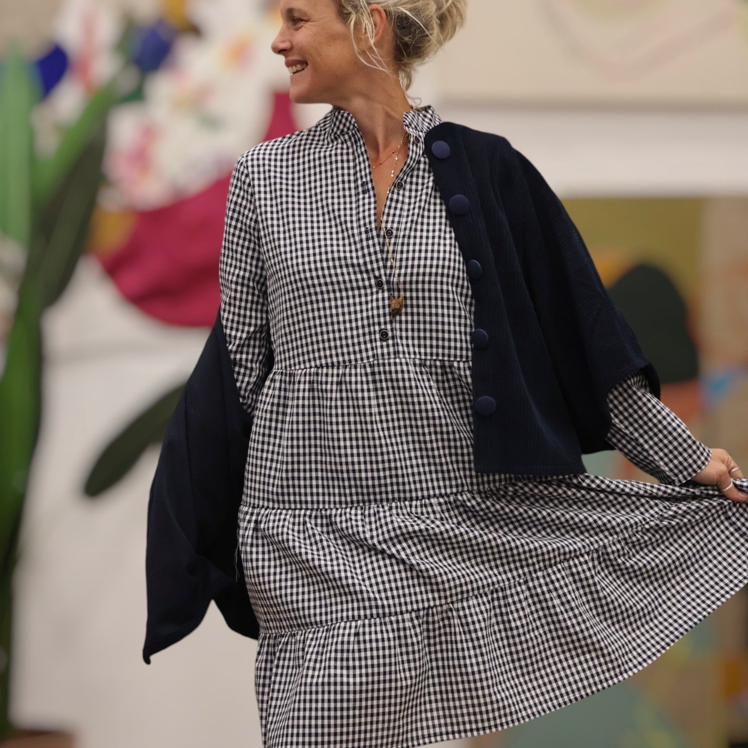 Bella incarne une élégance intemporelle, mariant harmonieusement confort et sophistication. Son style se caractérise par une jupe à étages, offrant un volume généreux dans le bas, un col mao et des manches longues.