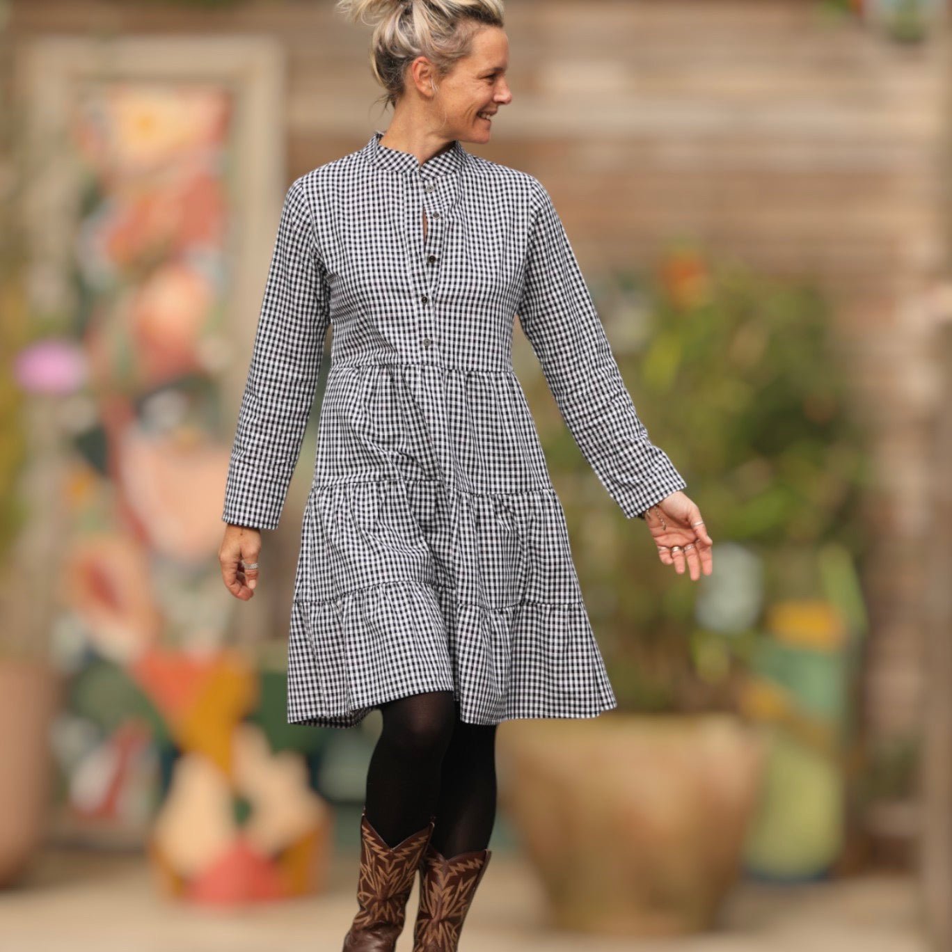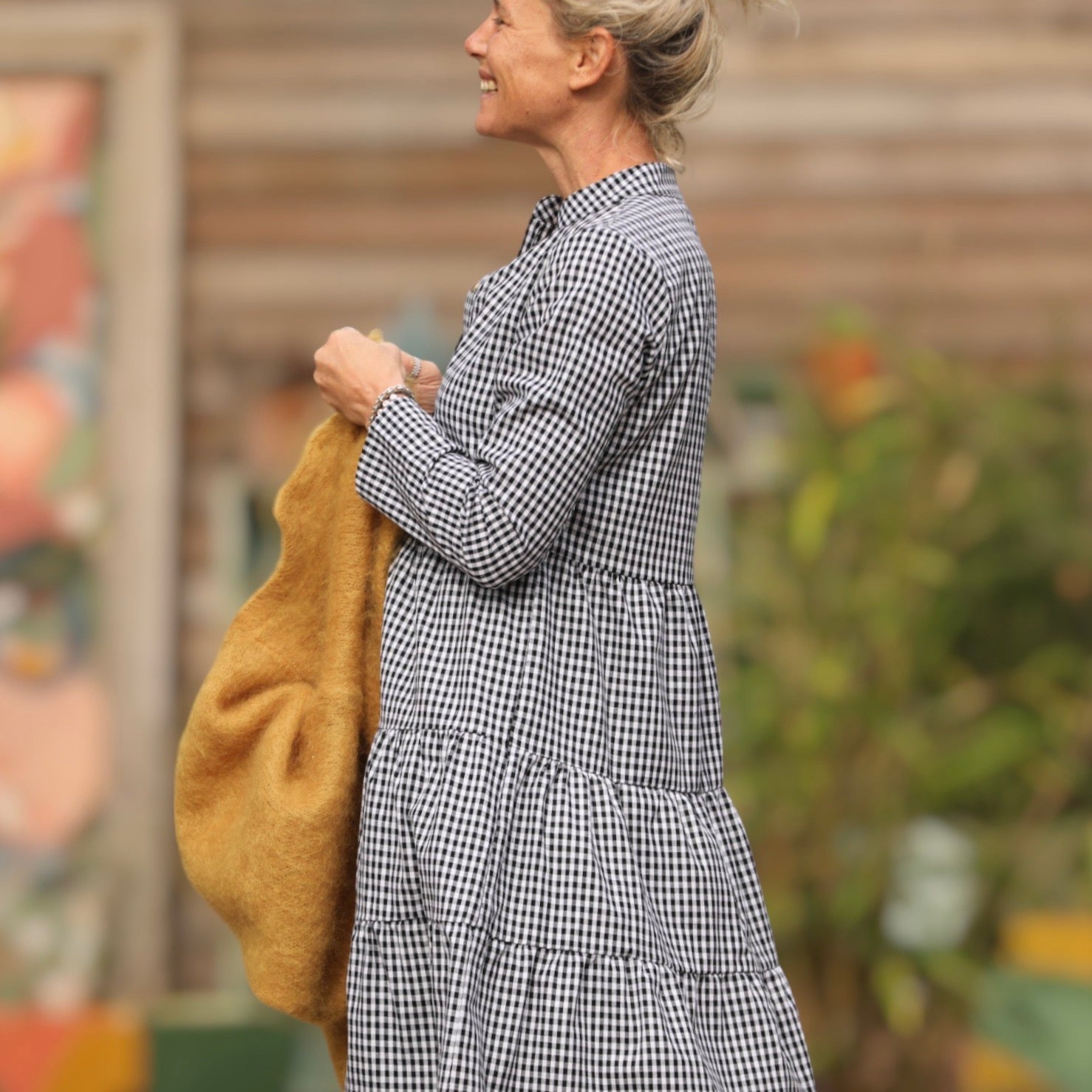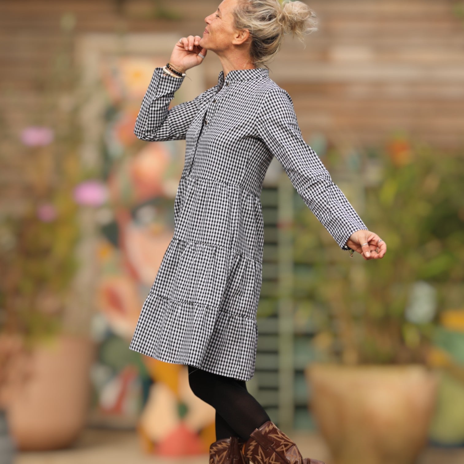 Bella incarne une élégance intemporelle, mariant harmonieusement confort et sophistication. Son style se caractérise par une jupe à étages, offrant un volume généreux dans le bas, un col mao et des manches longues.