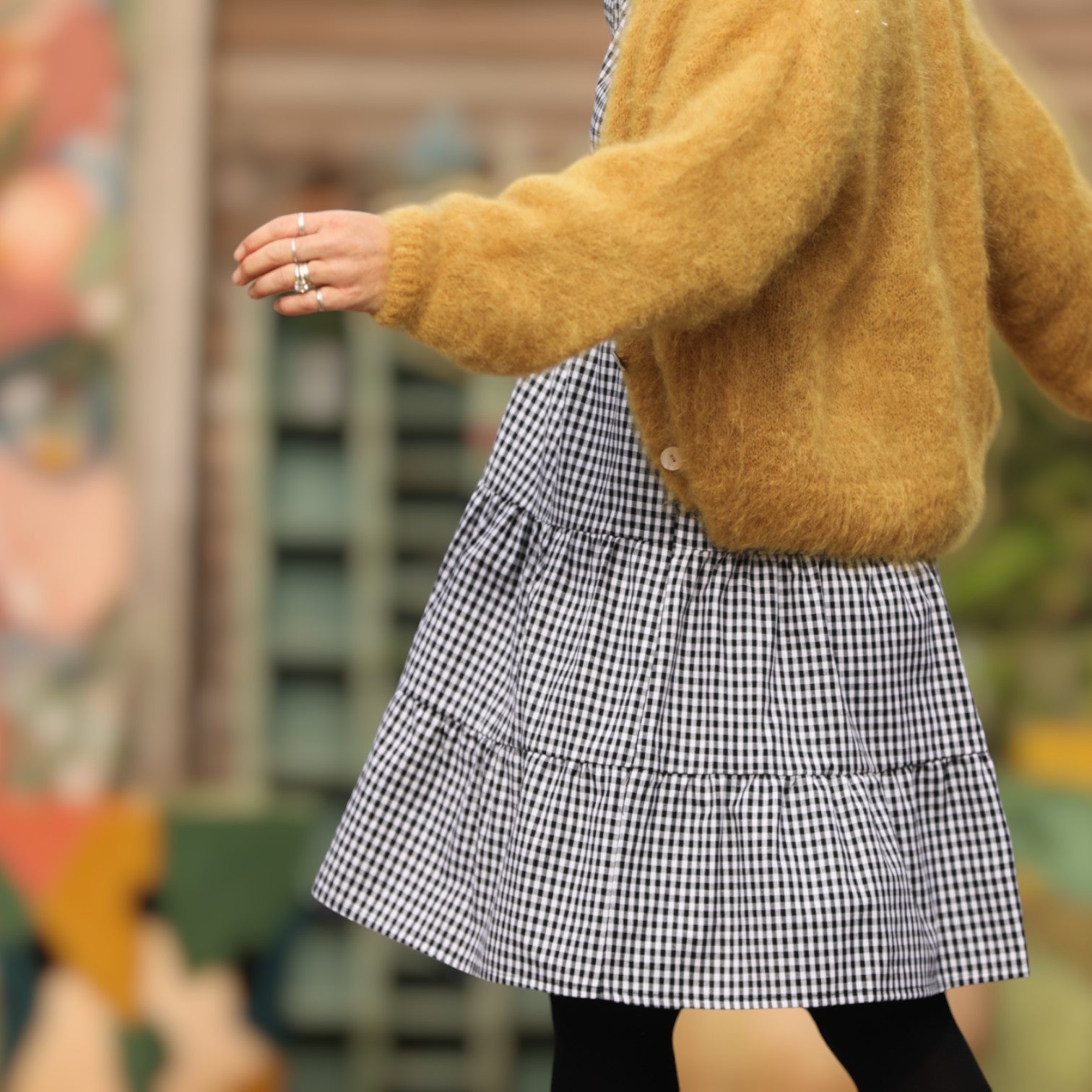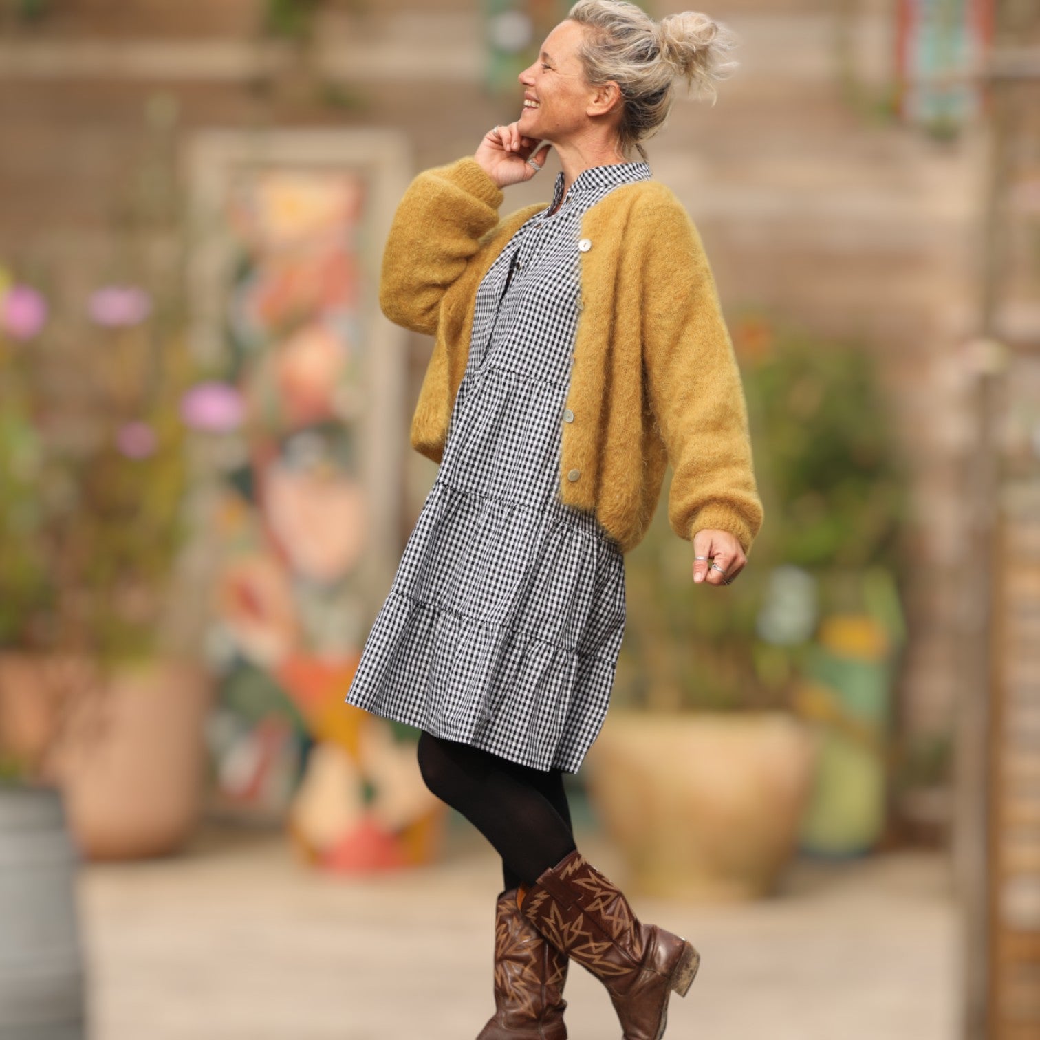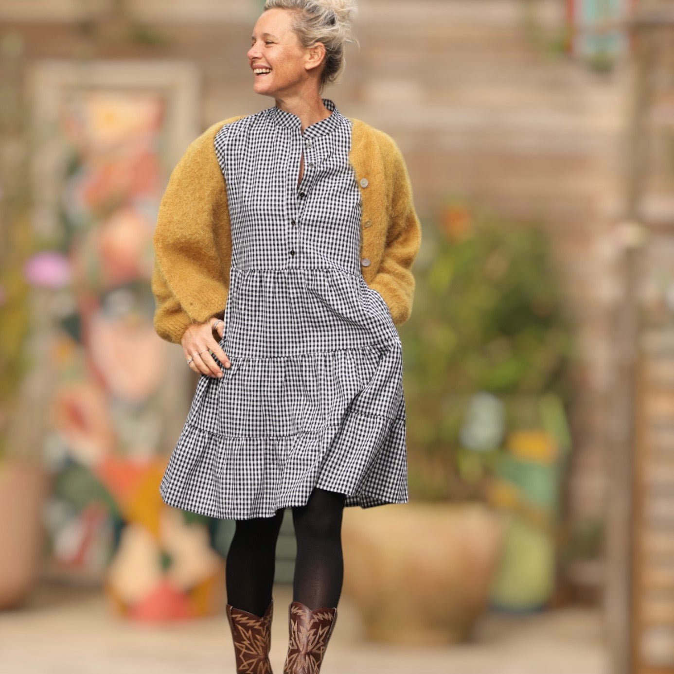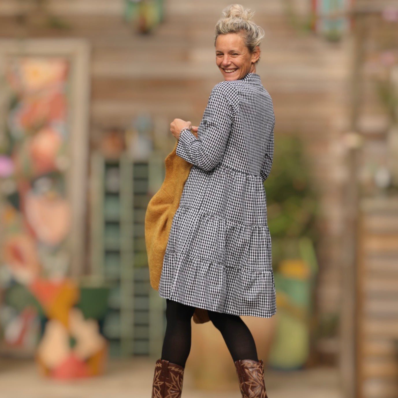 Bella incarne une élégance intemporelle, mariant harmonieusement confort et sophistication. Son style se caractérise par une jupe à étages, offrant un volume généreux dans le bas, un col mao et des manches longues.