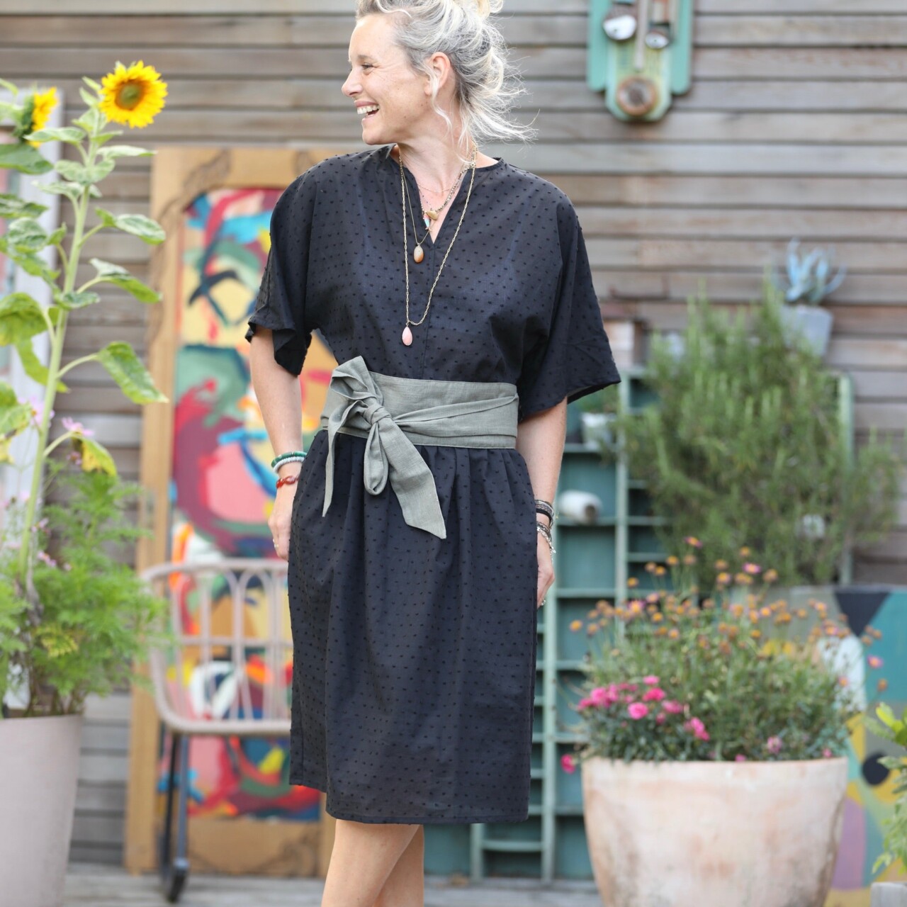 Capucine, une robe légère à la coupe kimono, dotée d’un décolleté V discret, d’une taille froncée subtile, de deux poches invisibles sur les côtés et d’une élégante longueur midi. Composition : 100% coton Marine porte la taille S pour 1m63, Mém une taille XXL pour 1m58.