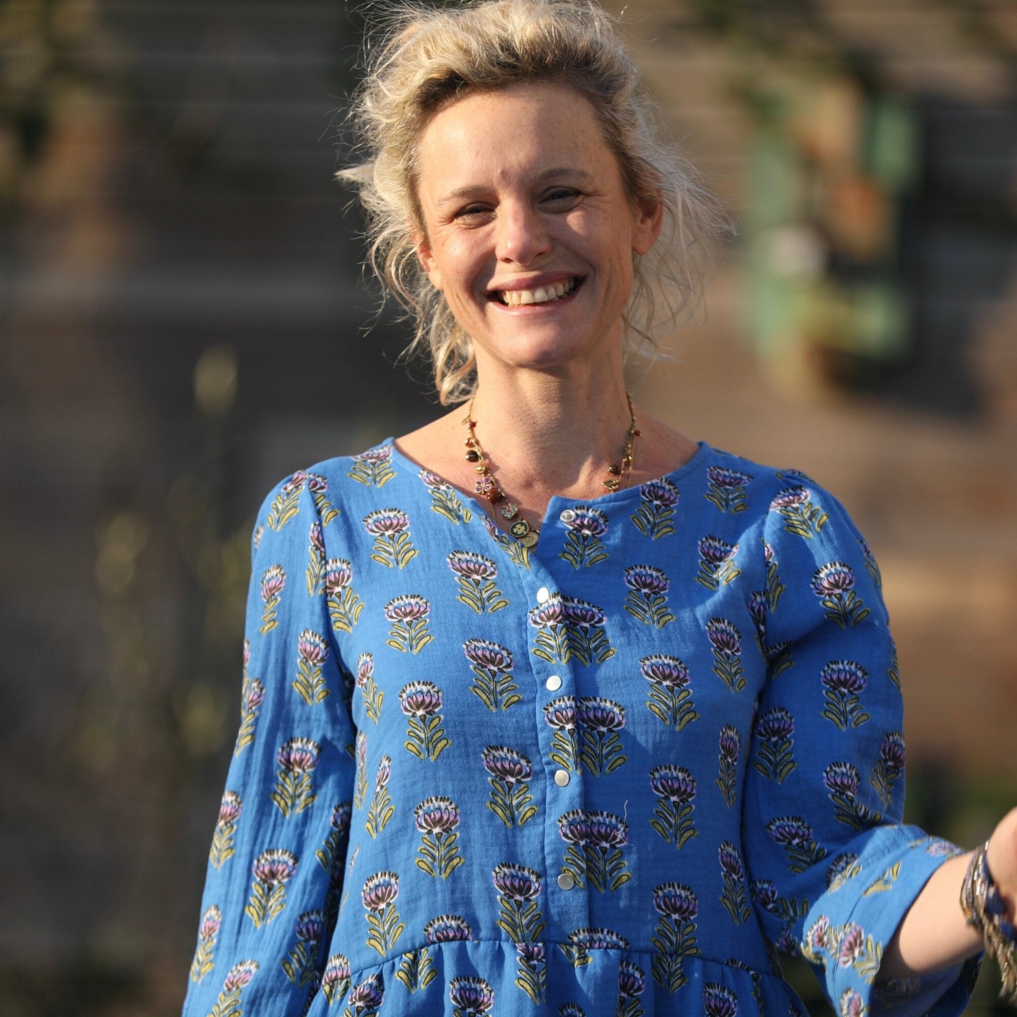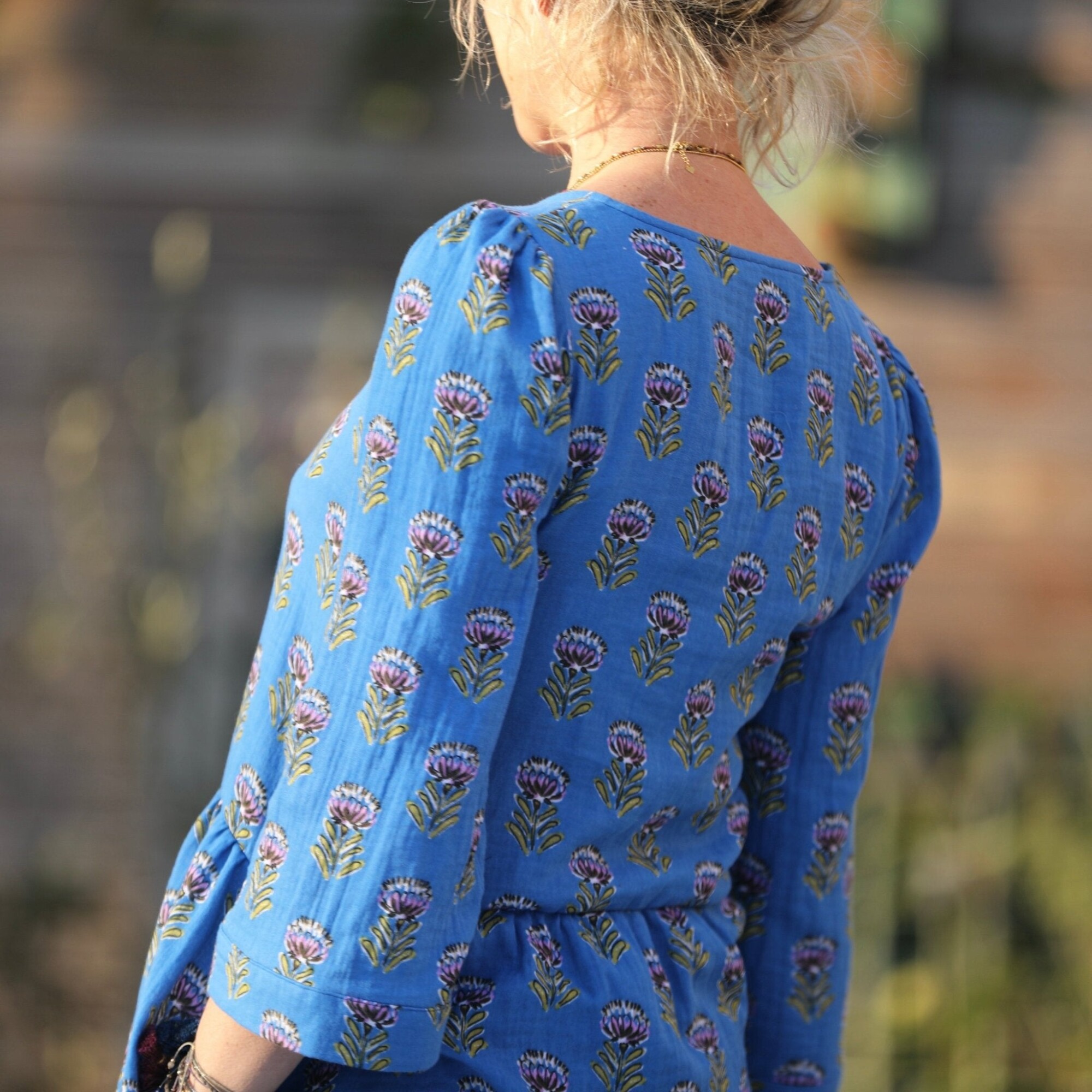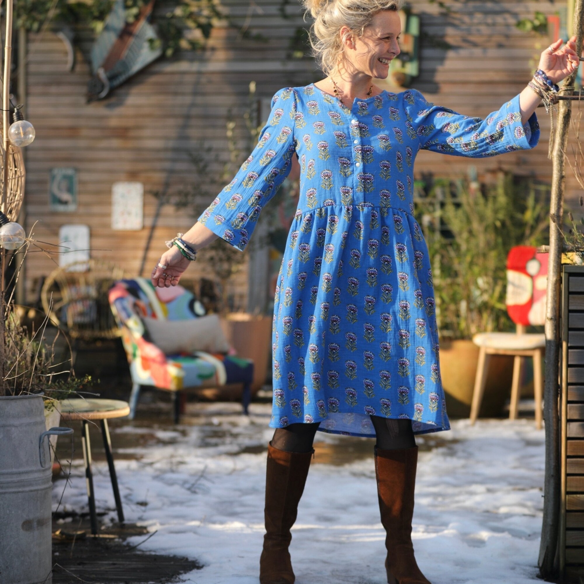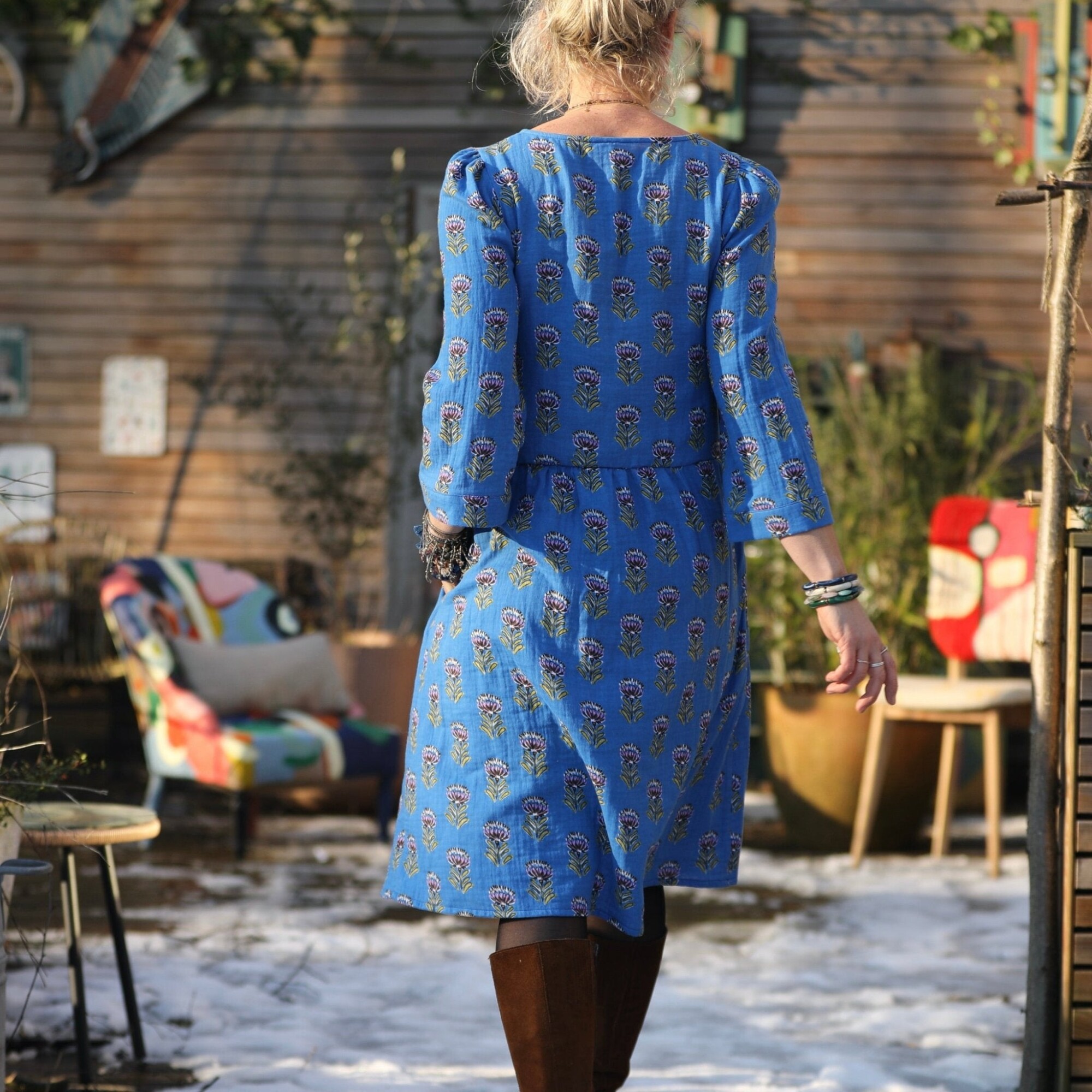 La robe Églantine se distingue par sa coupe midi et son joli col rond ajustable en col V grâce à des pressions. Sa jupe froncée à la taille garantit une grande liberté de mouvement, tandis que ses manches 3/4 dotées de poignets renforcés par un thermocollant assurent une tenue impeccable.