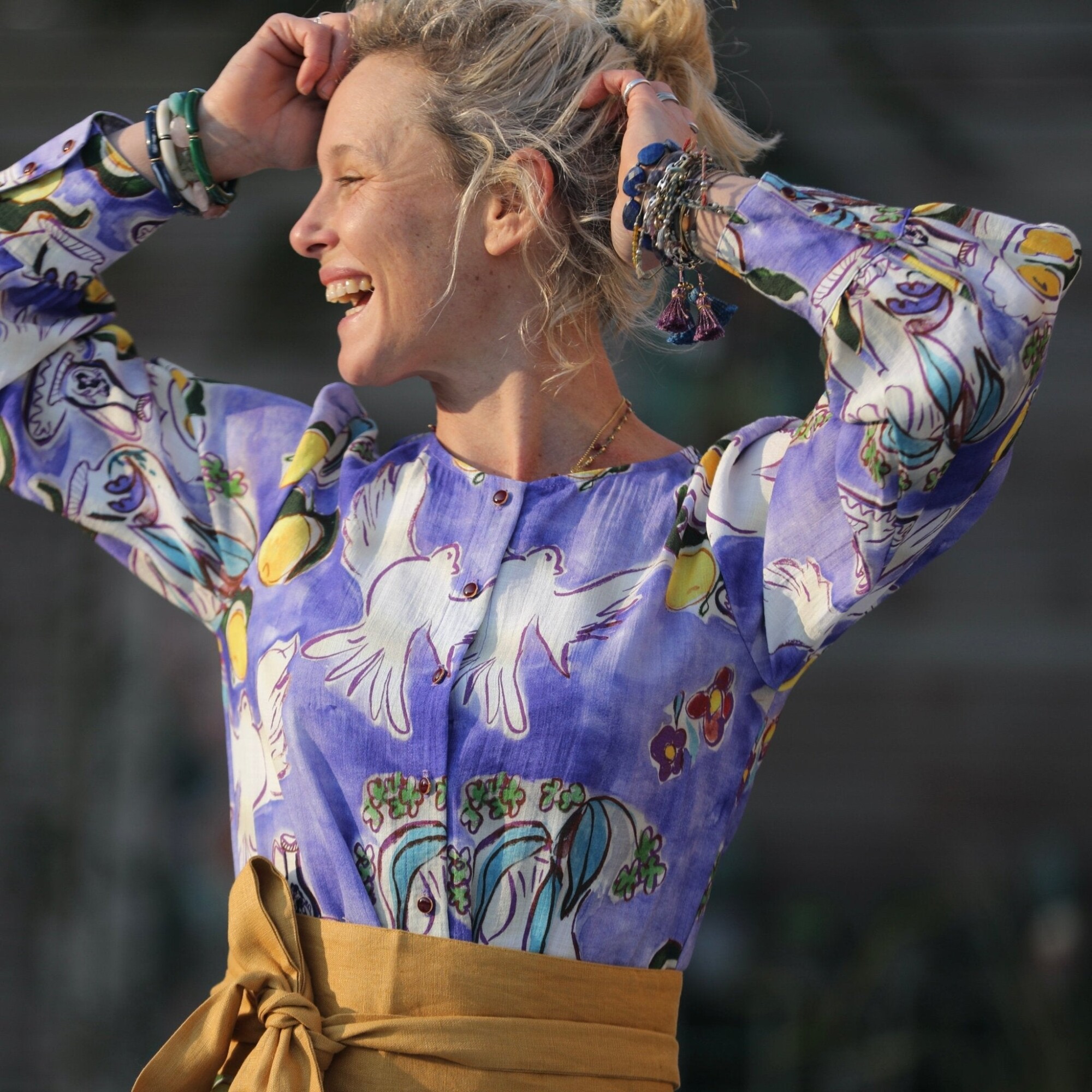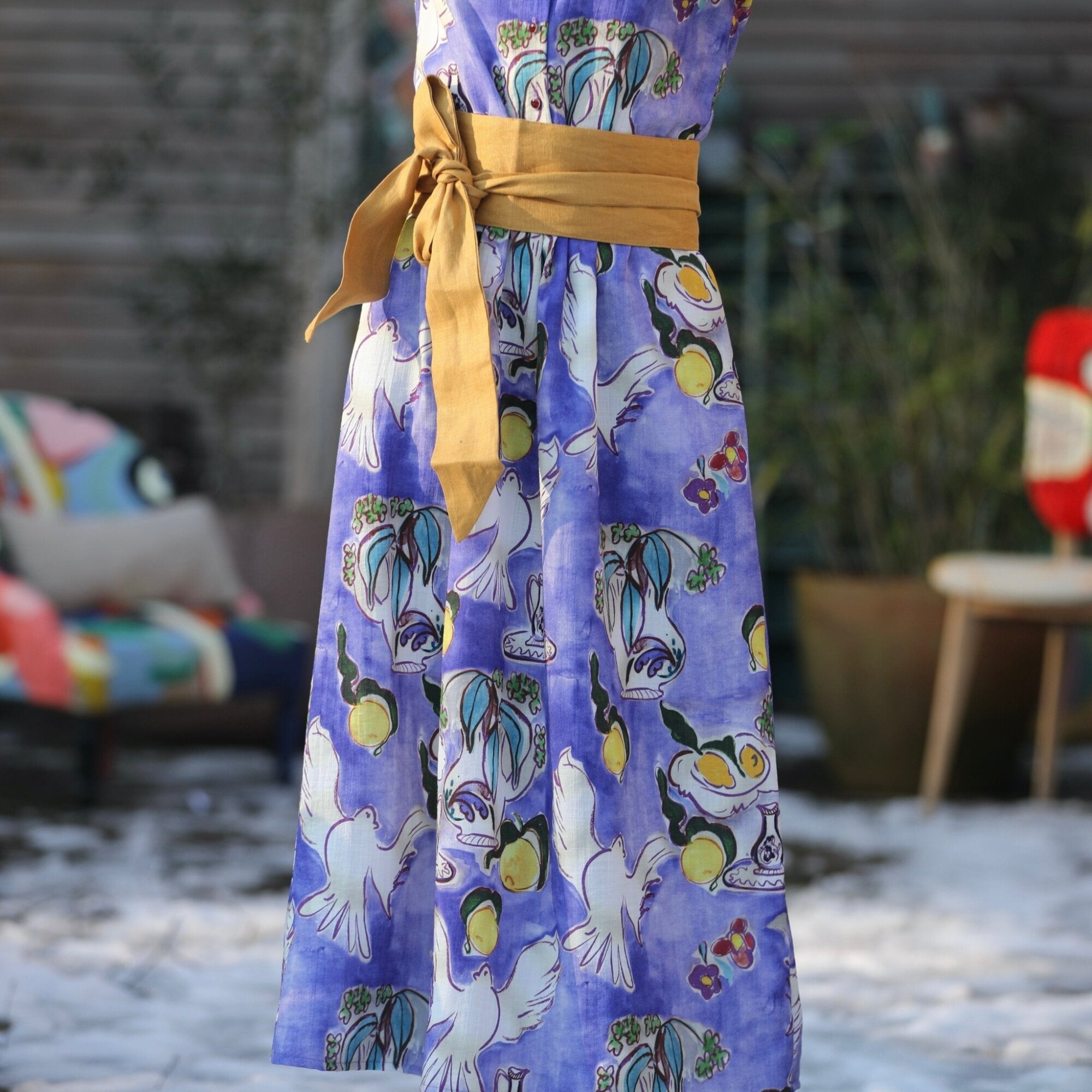 Isis est une robe élégante au col rond, dotée d'un boutonnage jusqu'à la taille. Ses manches longues, ornées de fronces aux épaules, se terminent par de larges poignets fermés par trois boutons, ajoutant une touche raffinée.