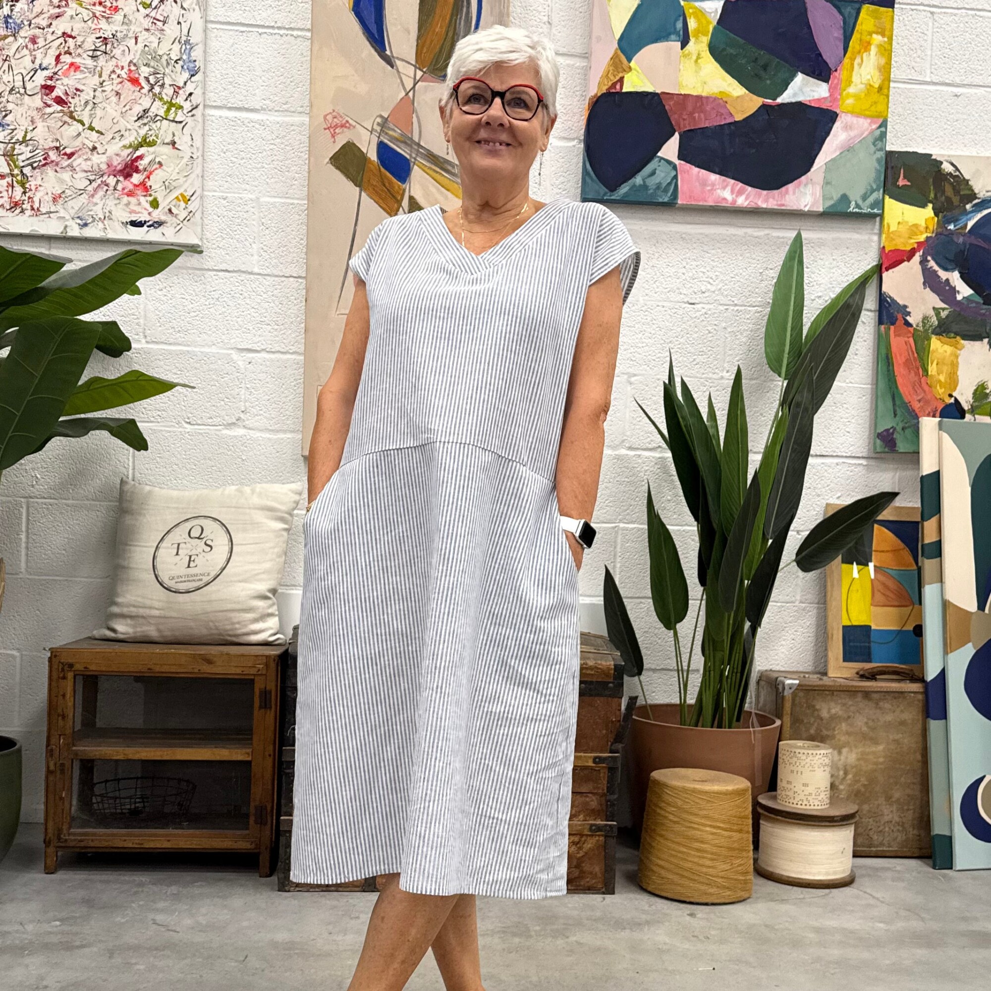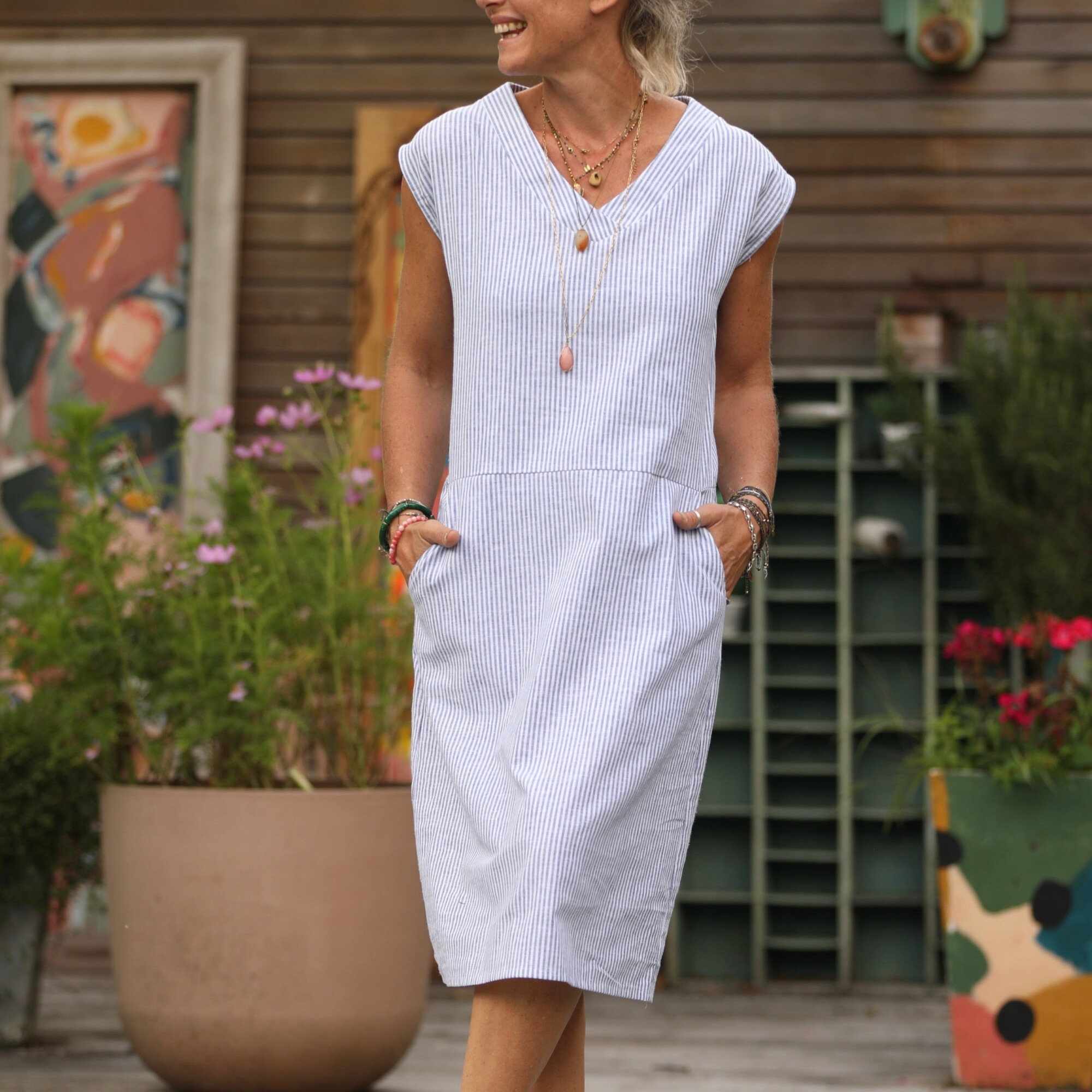 Ivy est une robe estivale facile à porter, élégante et décontractée, avec un joli col V croisé, une coupe kimono, des poches latérales et une longueur midi, sans fronces. Composition : 55% lin - 45% coton Marine porte la taille S pour 1m63, Mém une taille XXL pour 1m56, Fanny, un XXL pour 1m68 et Patricia une taille L :-) Fabriqué en France dans notre atelier roubaisien.