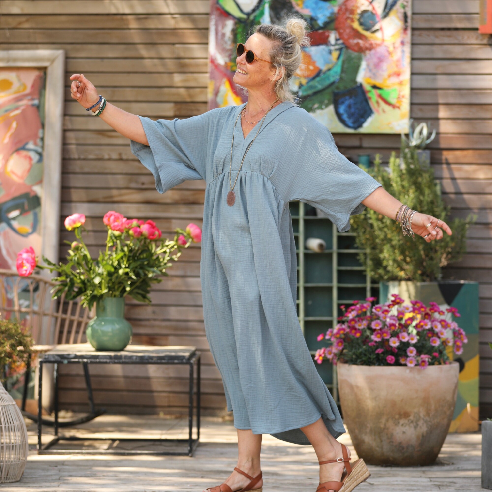 Kalaya est une robe inspirée de l'esthétique japonaise, mettant en valeur des manches kimono amples et une coupe structurée sous la poitrine. De délicats plis sous la poitrine et des fronces sur la jupe apportent une belle ampleur et un mouvement gracieux à la silhouette.