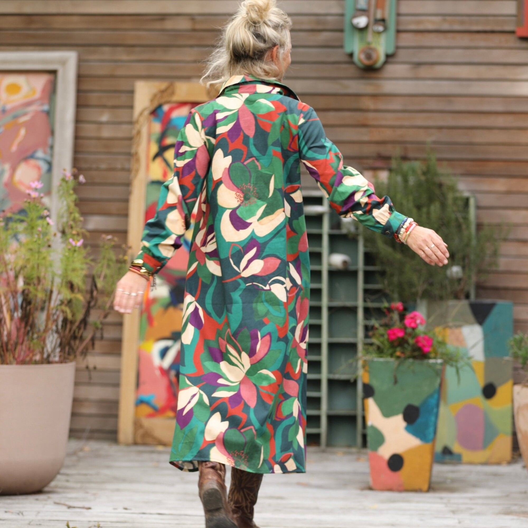 Pensée est une robe chemise à la coupe trapèze fluide, pensée pour allier confort et allure. Longue et boutonnée de haut en bas, elle se distingue par son beau col chemisier, ses poignets fermés par un bouton et ses poches latérales discrètes qui en font une pièce à la fois pratique et féminine.