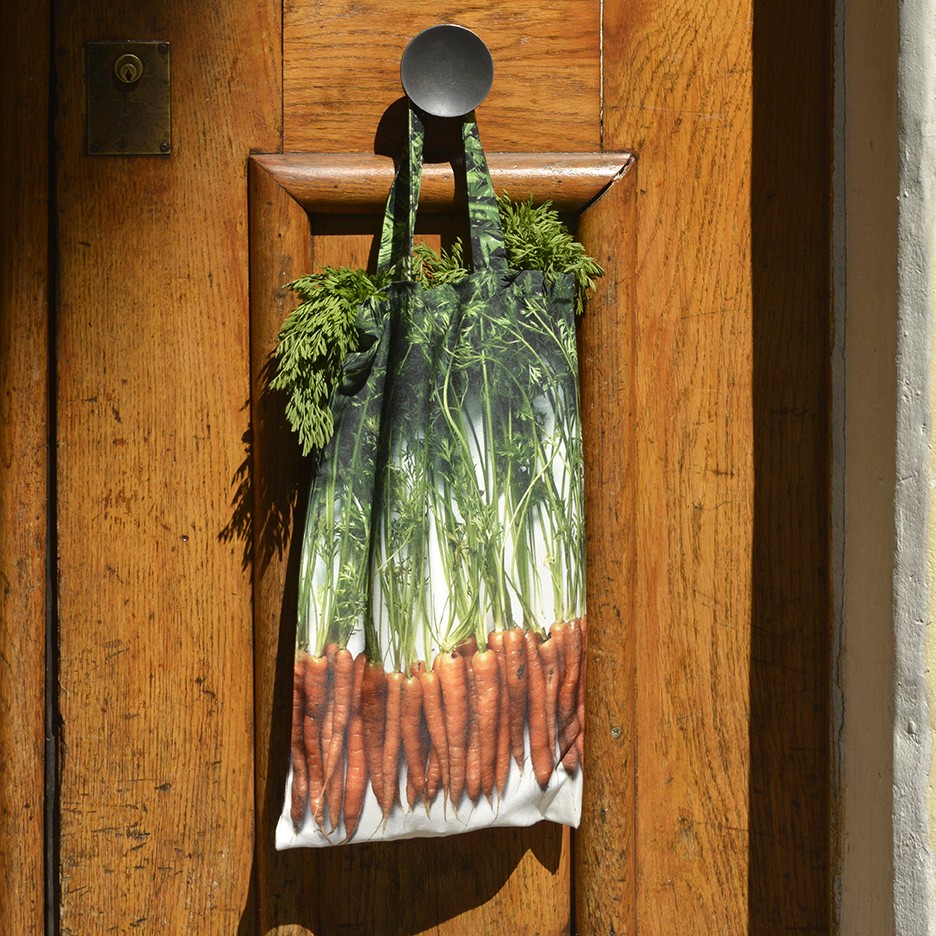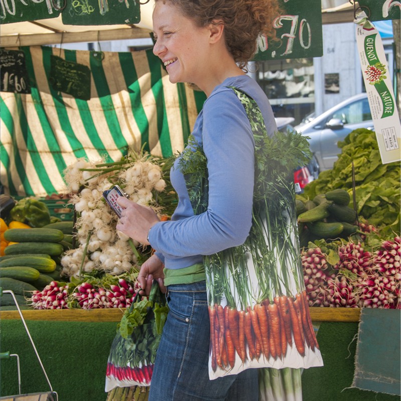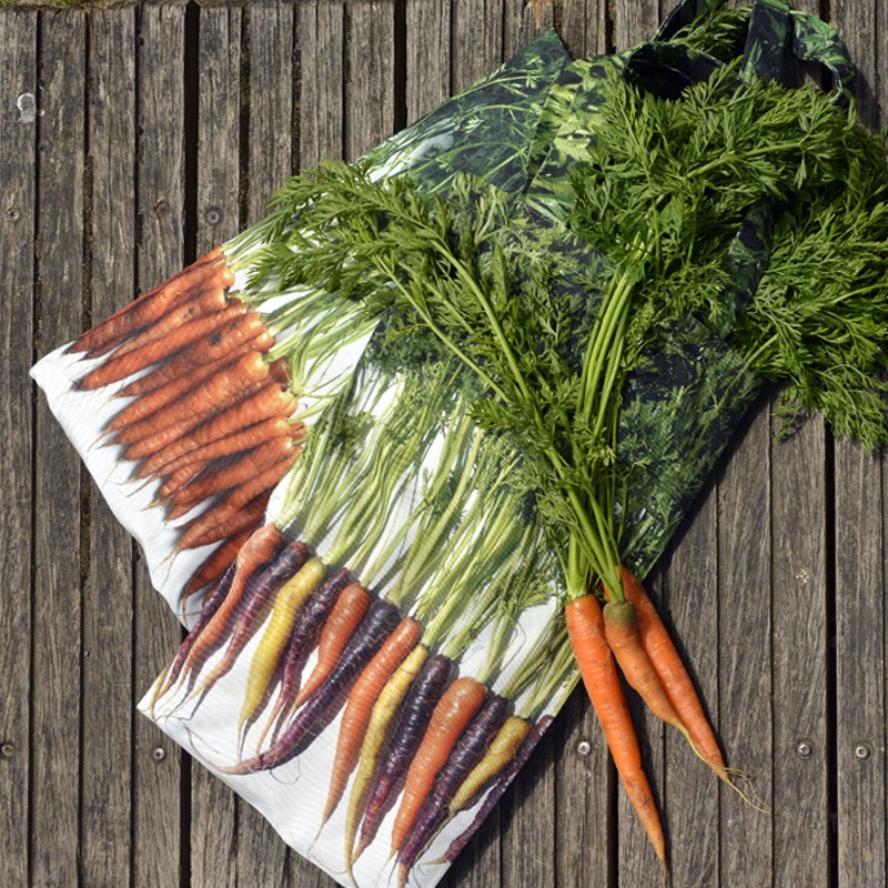 Les sac de courses made in France de Maron Bouillie sont fabriqués dans du polyester recyclé. Craquant ! Choisissez le sac imprimé carottes !