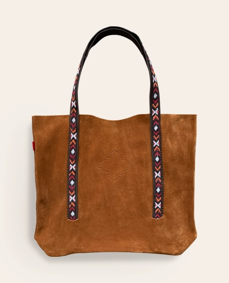 Sac style cabas en cuir velours Sable fabriqué à la main en Isère.Anse en cuir avec sangle coton fantaisie.