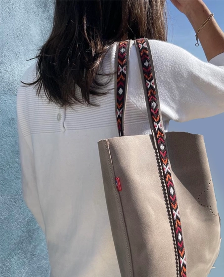 Sac style cabas en cuir ciré Taupe fabriqué à la main en Isère.Anse en cuir avec sangle coton fantaisie.