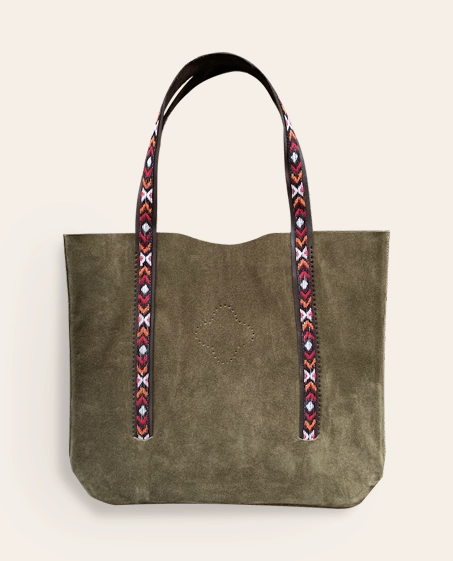 Sac style cabas en cuir velours Vert fabriqué à la main en Isère.Anse en cuir avec sangle coton fantaisie.