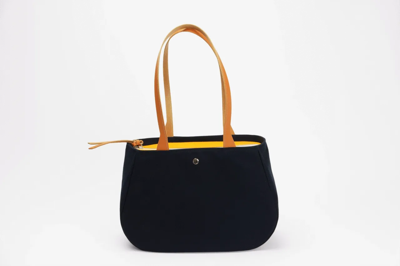 Sac fourre-tout cabas en toile et cuir - bicolore bleu marine et jaune
