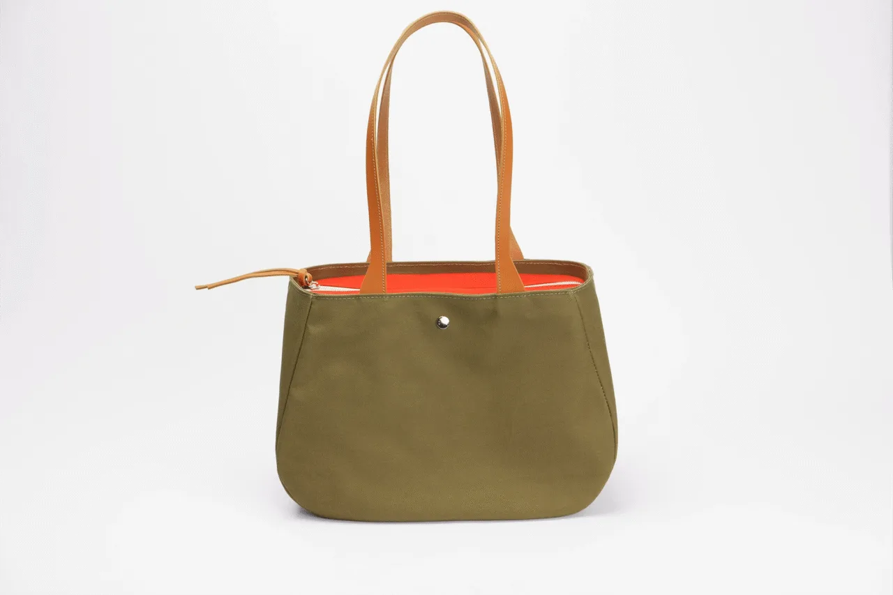 Sac fourre-tout cabas en toile et cuir - bicolore kaki et orange