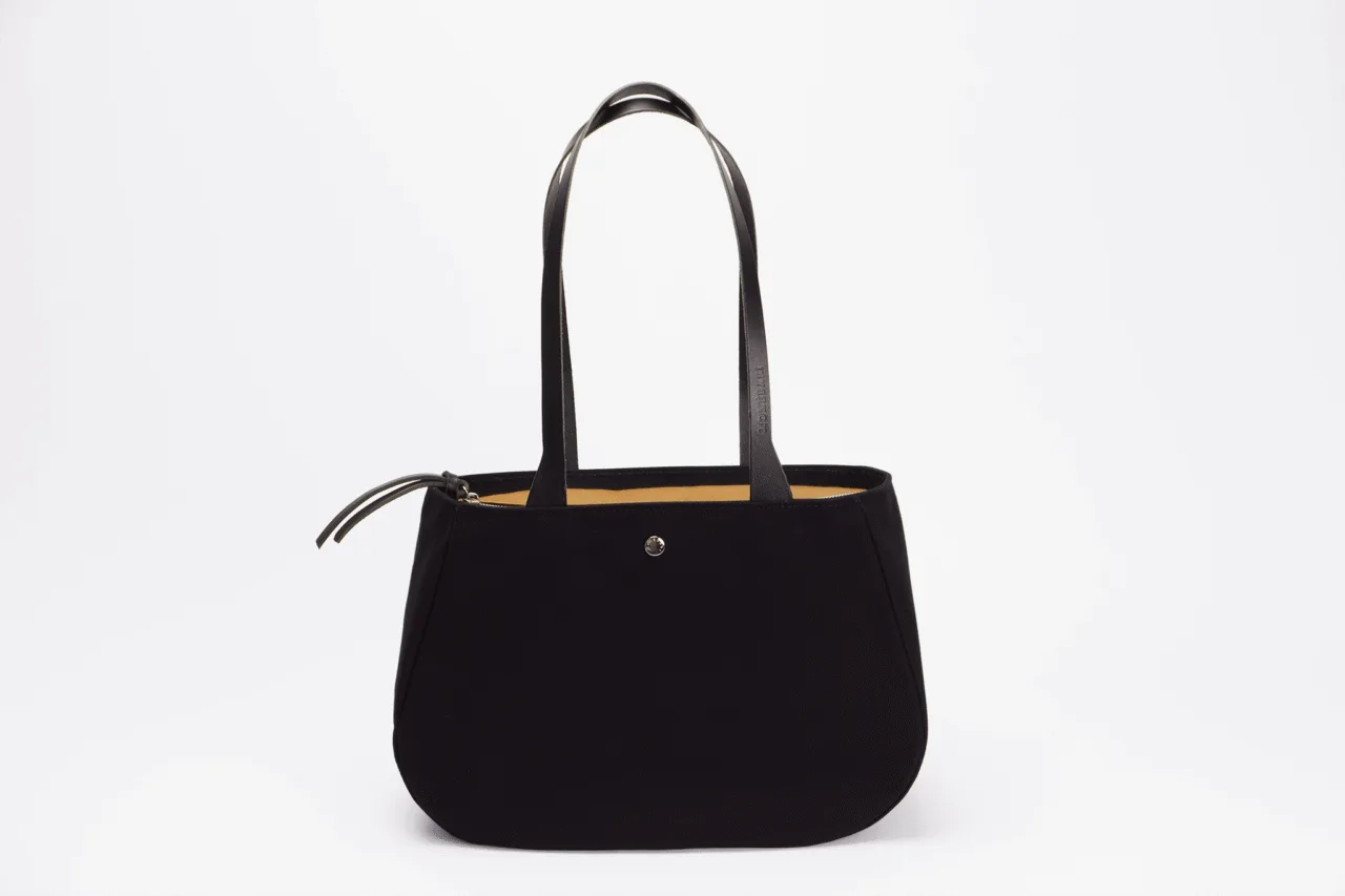 SAC CABAS NOIR TOILE ET CUIR MADE IN FRANCE Le sac cabas Monébari réinterprète le sac pratique et logeable du quotidien avec des lignes simples et élégantes. Pensé pour accueillir l’essentiel et plus encore, il réussit le pari d’une élégance raffinée et d’un style affirmé. La découpe de ses anses en cuir est l'expression de l'esprit Monébari : faire simple et beau. Les anses permettent un porté main ou un porté épaule.