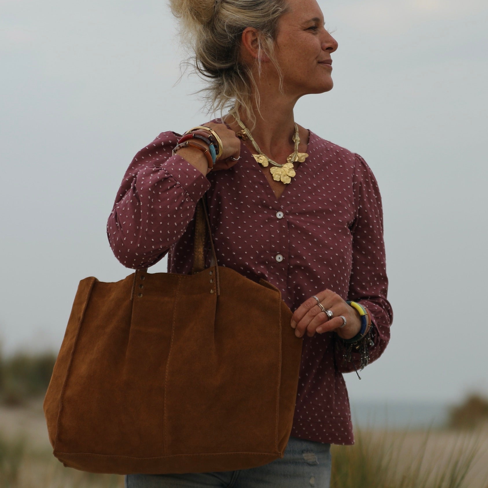 Trouvaille Quintessence, le sac Lisière est fabriqué en Italie. Confectionné en cuir suédé caramel aux reflets chaleureux, il se distingue par ses anses irisées qui captent la lumière avec subtilité.