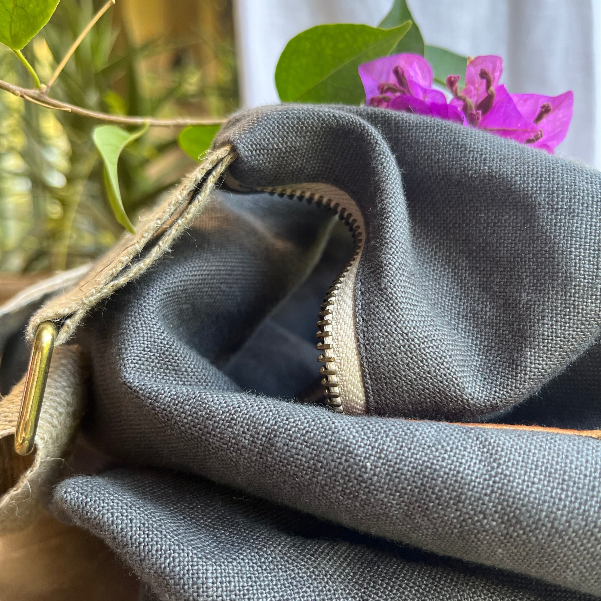 Voici Maud, un sac chic en forme de demi-lune. Il est doublé de jean noir et a deux poches internes, plus une fermeture éclair bronze.