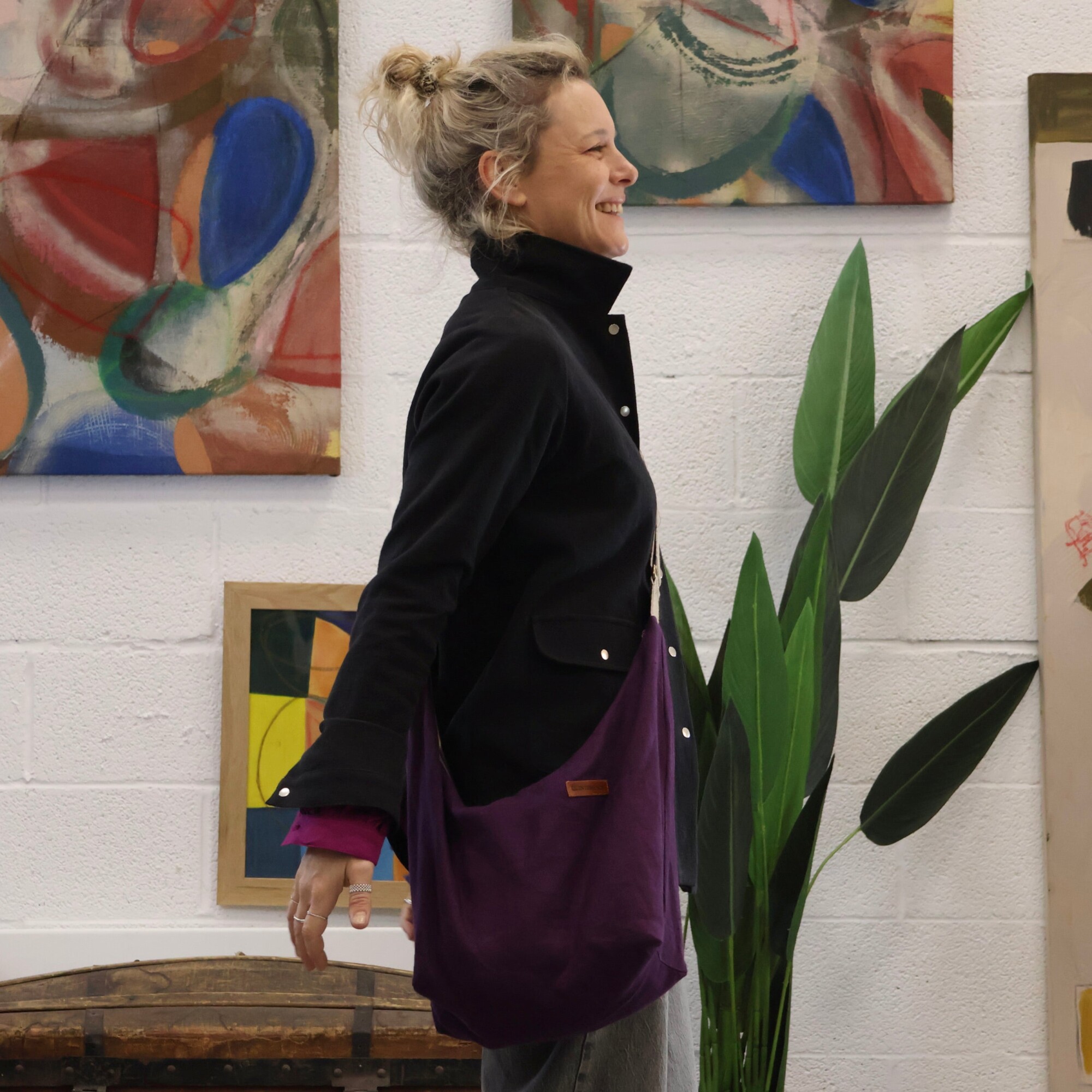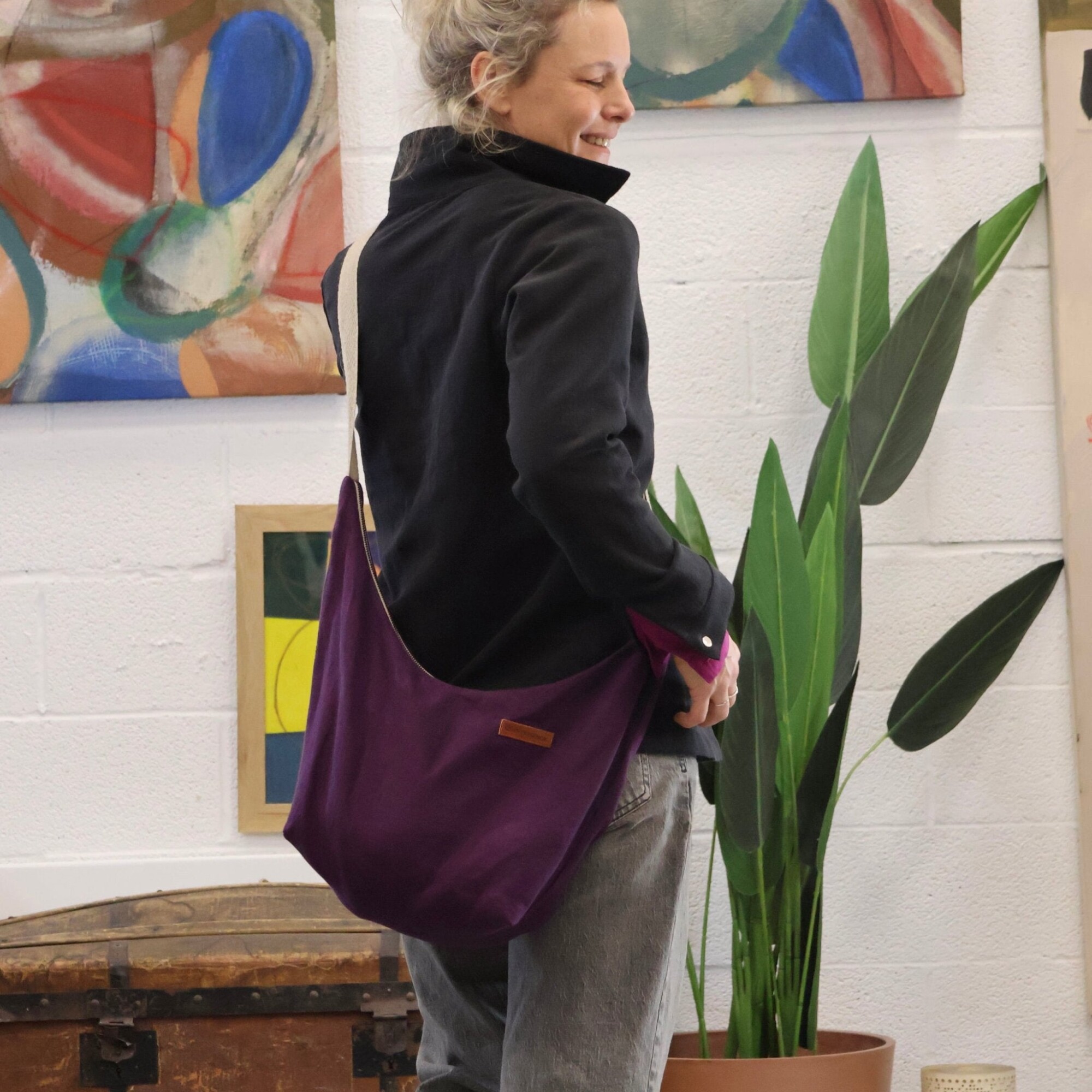 Voici Maud, un sac chic en forme de demi-lune. Il est doublé de lin naturel et a deux poches internes, plus une fermeture éclair bronze.