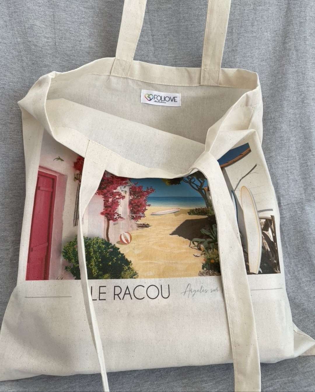 Ensemble composé d'un Tote Bag et sa pochette de sac, sur lesquels figurent l'illustration originale de la Plage du Racou à Argelès sur mer ©Foliove.Un travail artisanal et familial, dans lequel Foliove s’est associé à Cat@stroff pour vous proposer cette trousse originale et colorée (jusqu’à la fermeture éclair !)