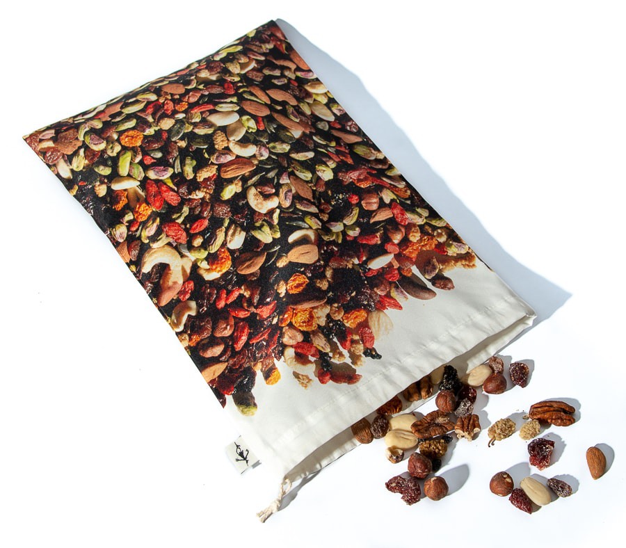 Choisissez le sachet imprimé Fruits secs ! Écologique et pratique, cette pochette en tissu est fabriqué en France.