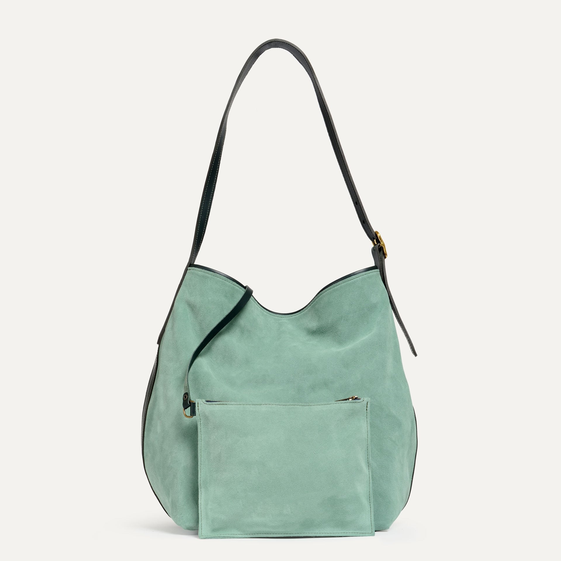 Sac seau Sofia Vert Jade en cuir suédé français. Grand sac femme au style intemporel, bandoulière réglable, pochette intérieure zippée. Fabriqué en France.