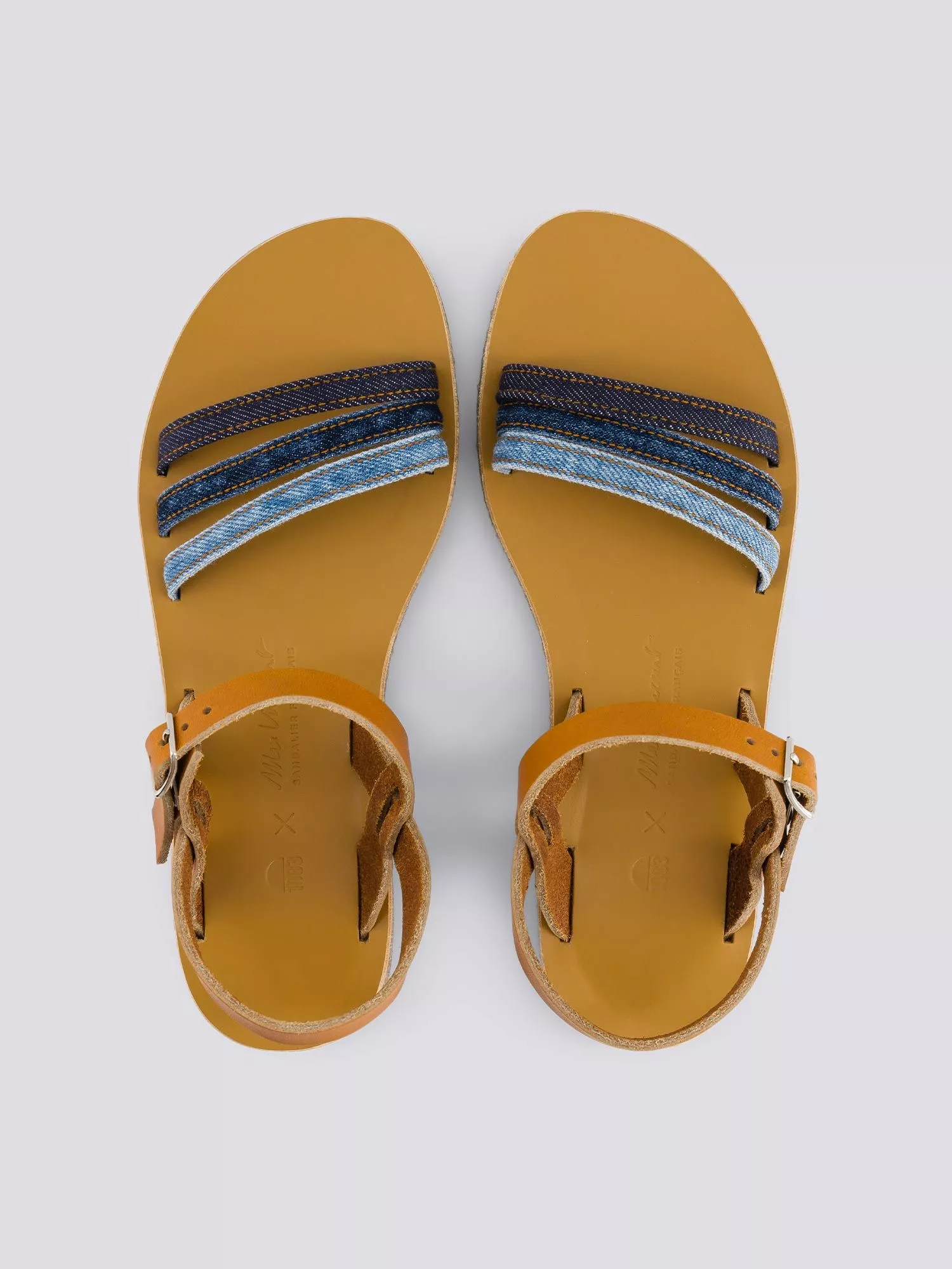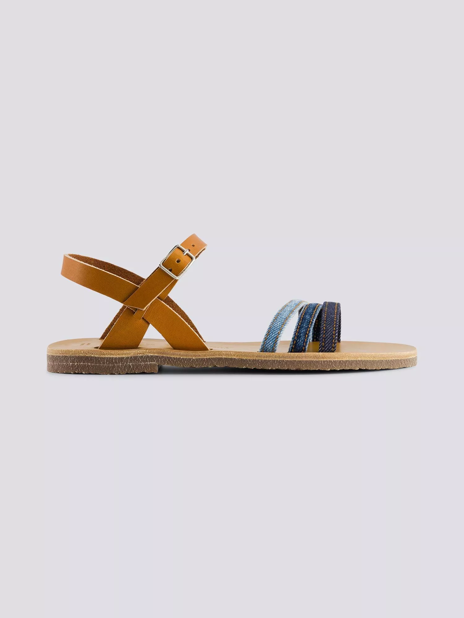 LES SANDALES EN SUPERDENIM Flora 931, la sandale cuir et denims multicolores par 1083 et l'atelier Max Vincent.Un parfait mélange de couleurs entre le cuir camel et le tissu SuperDenim indigo brut, délavé clair et océan de nos jeans ! Avec leur qualité irréprochable et leur mix de matières, cette collaboration est à la croisée de nos deux univers.