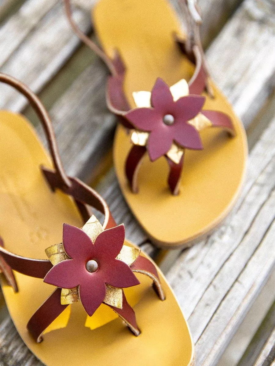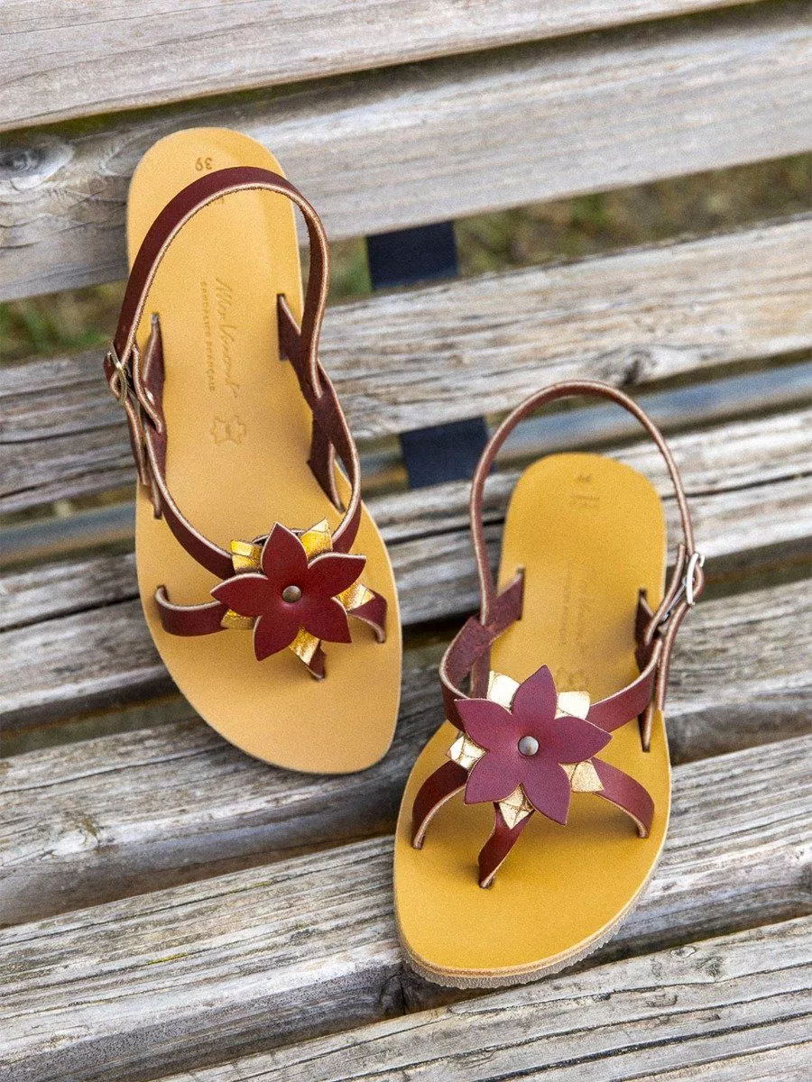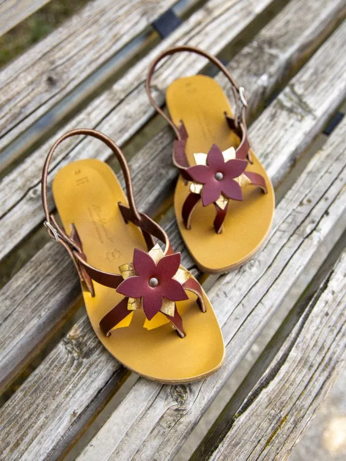 LES SANDALES FLEURIES Voici la sandale fantaisie avec fleur en cuir CEYLAN. Avec sa couleur bordeaux et sa fleur dorée, elle apportera de l'originalité à votre tenue.
