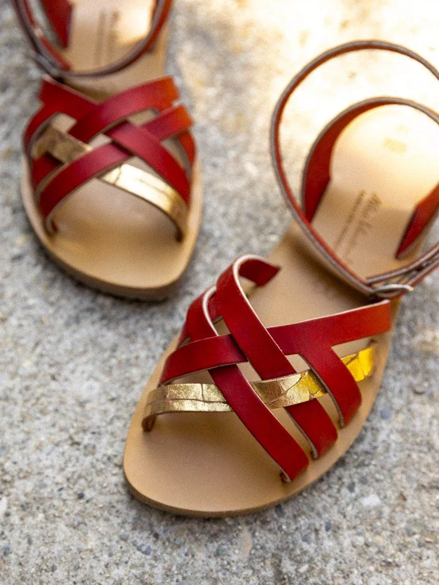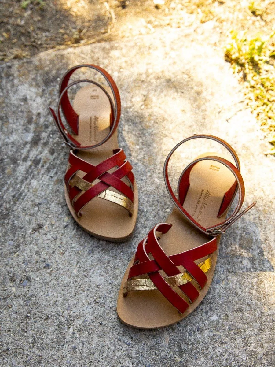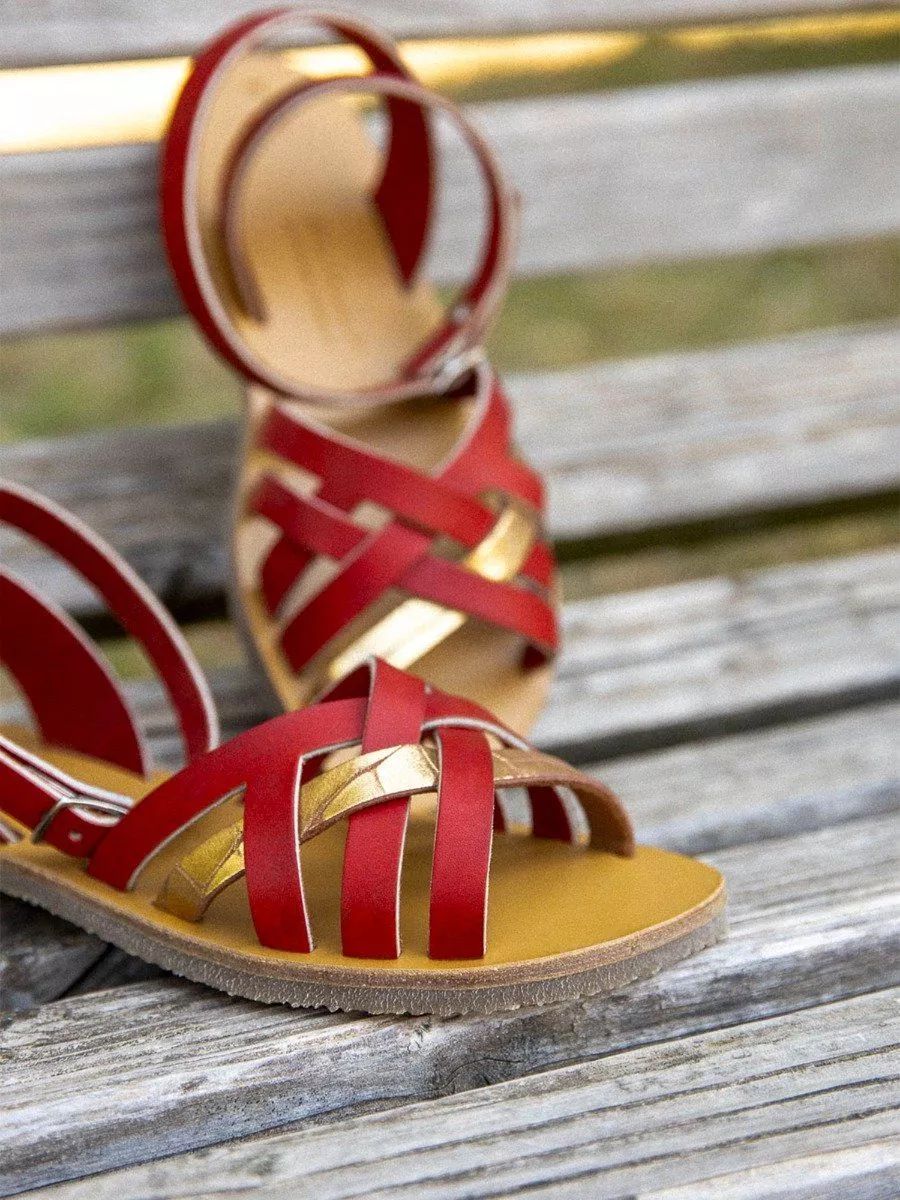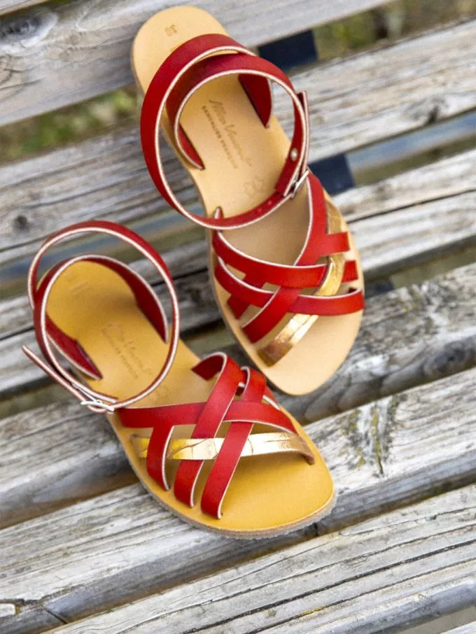 Sandales brides croisees murcia alba cuir tannage vegetal rouge dore femme