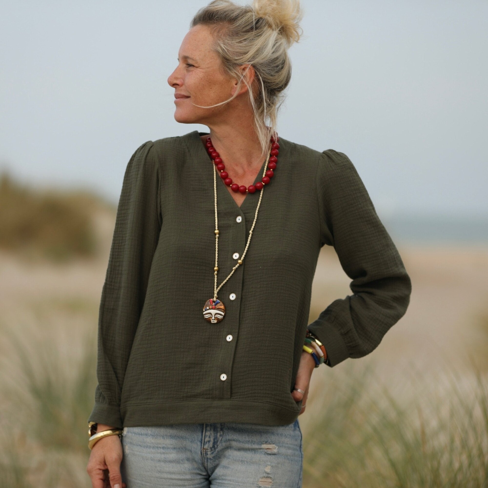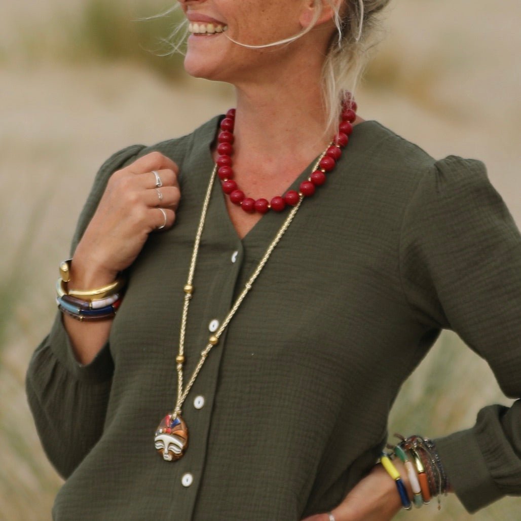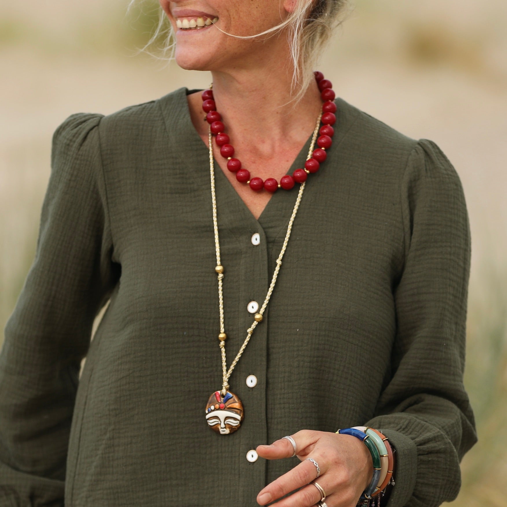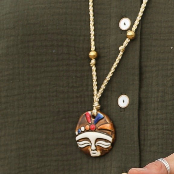 Le sautoir Oraison se distingue par son pendentif sculptural en forme de visage, travaillé en pierre émaillée aux nuances chaleureuses. Monté sur un cordon tressé ponctué de perles dorées, il mêle force symbolique et élégance bohème.